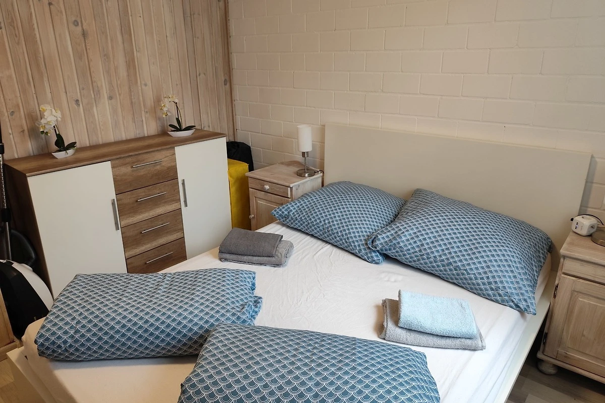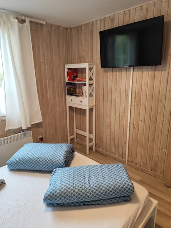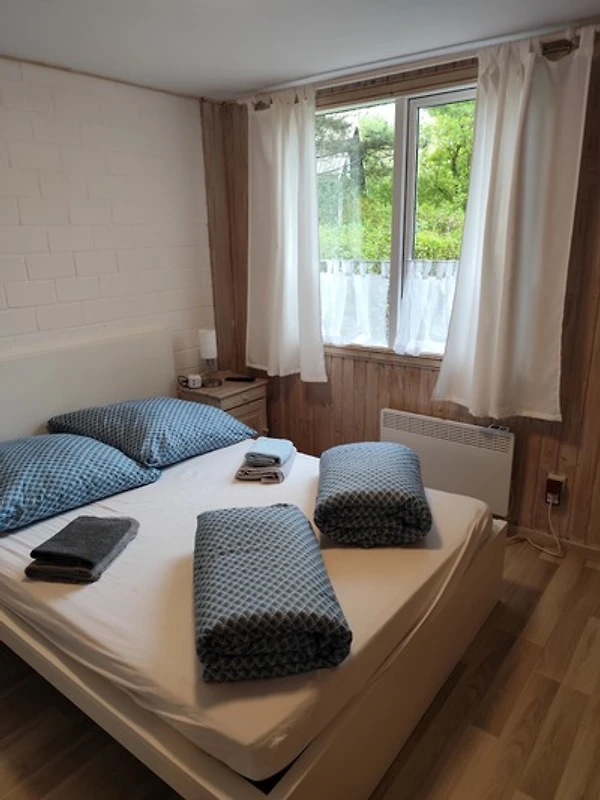 Das an den Wohnraum angrenzende Schlafzimmer ist mit genügend Stauraum und einem Multimedia Smart-TV ausgestattet.
