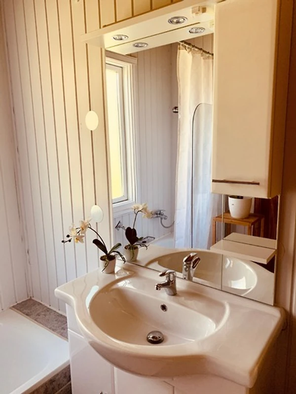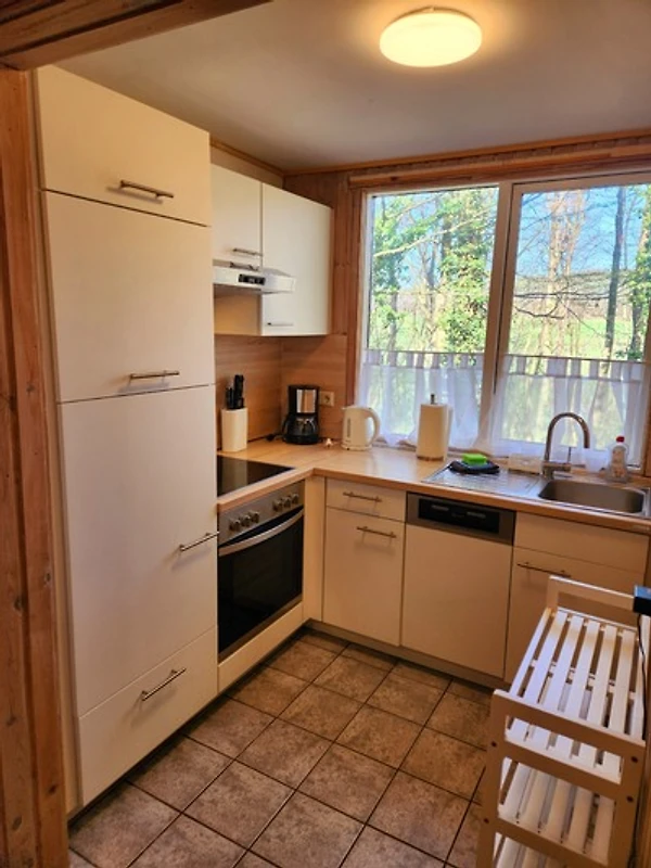Die zum Wohnraum offene und neue Küche verfügt u.a. über einen Backofen und Ceranfeld, Geschirrspülmaschine, einen Kühlschrank mit Gefrierfach, Mikrowelle, Toaster, Wasserkocher und viele weitere wichtige Utensilien.
