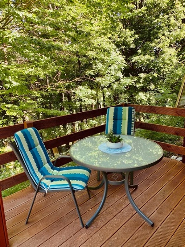 Vom Wohnraum haben Sie direkten Zugang auf Ihre wunderschöne Terrasse mit einem tollen Blick direkt in den Wald, die zum Verweilen einlädt. Es ist keine Seltenheit beim Frühstück oder beim Abendessen Rehe und Eichhörnchen zu beobachten.
