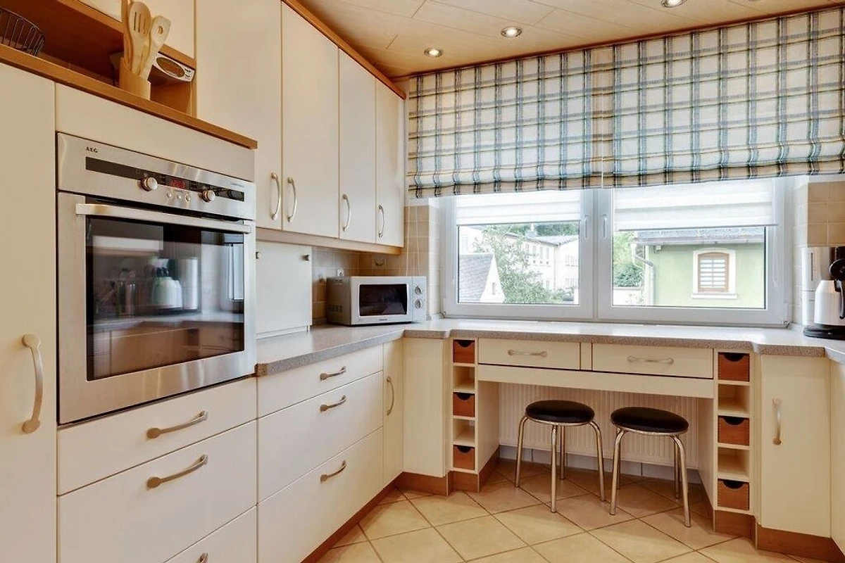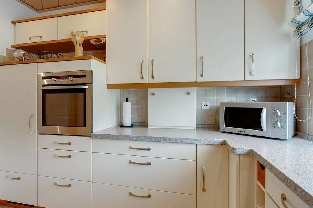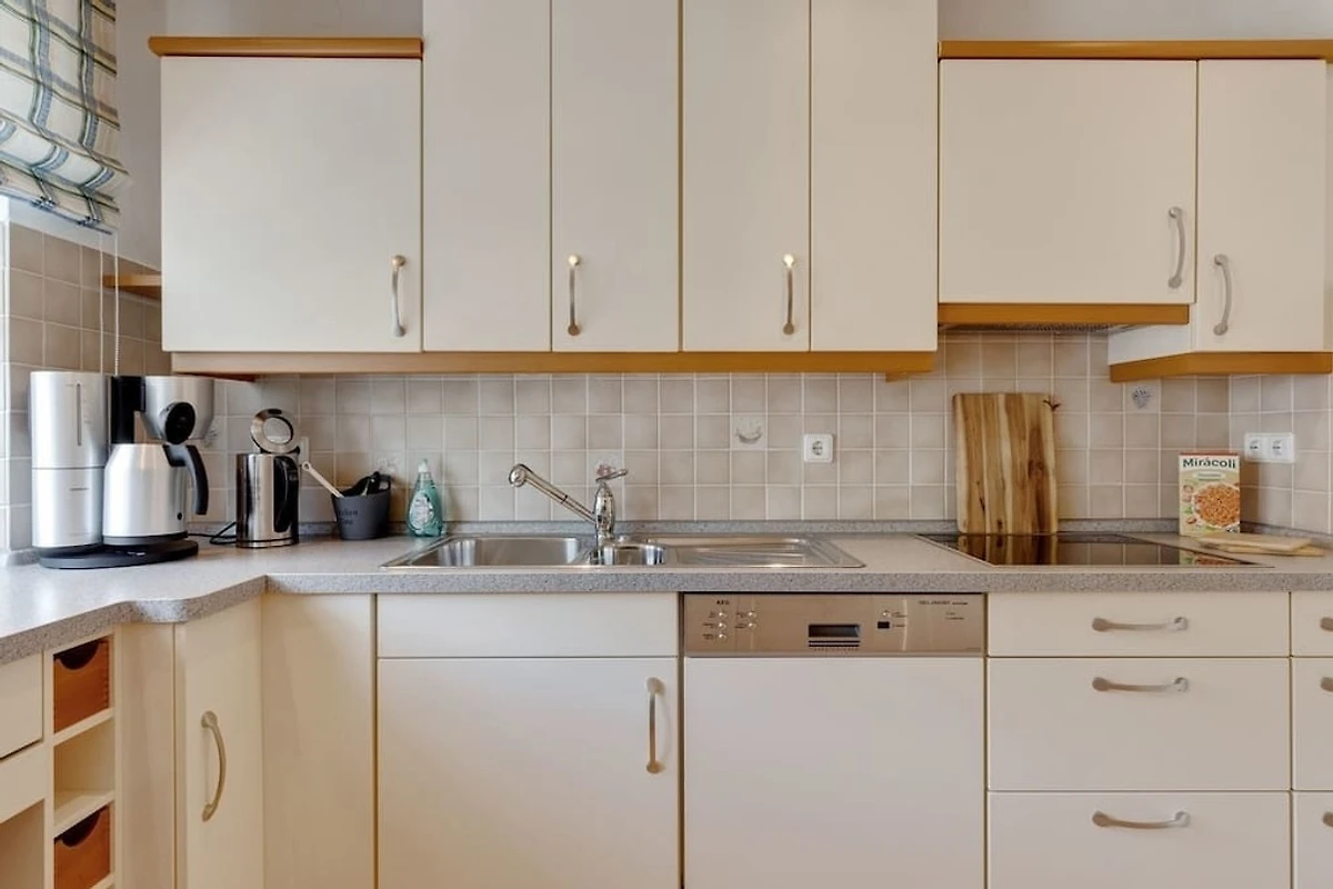 Küche (mit Herd, Backofen, Sitzecke, Wasserkocher, Kaffeemaschine, Mikrowelle, Spülmaschine, Kühlschrank),