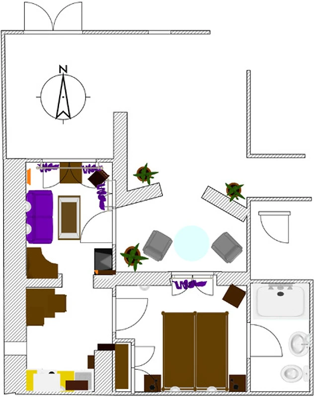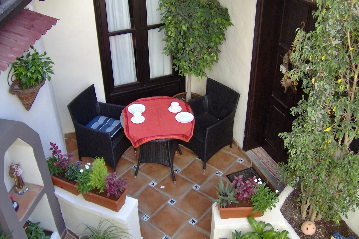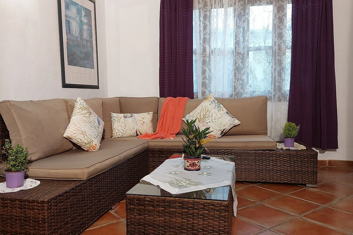 Mediterrane Ferienwohnung in Orange- und Violetttönen. Die Ferienwohnung verfügt über ein sehr ruhig gelegenes Schlafzimmer, ein stilvolles Wohnzimmer, eine kleine ans Wohnzimmer ohne Tür anschliessende Küche, ein Bad mit Dusche sowie eine gemütliche Sitzgelegenheit auf der kleinen Innenhof-Terrasse. Alle Fenster gehen zum Innenhof. Neben der eigenen kleinen Terrasse im Innenhof kann natürlich auch jederzeit die grosse Gemeinschafts-Dachterrasse genutzt werden. Der Flachbildfernseher verfügt über Satellitenempfang mit ca. 450 internationalen Sendern- darunter alle frei empfangbaren deutschen Kanäle - sowie durch Umschalten auf der Fernbedienung über DVB-T-Empfang mit den gängigen spanischen Fernsehsendern. Zudem kann auf Anfrage kostenlos Netflix bereitgestellt werden. Unser Haus verfügt über Internetanschluss per Glasfaser und in allen Unterkünften sowie auf der Dachterrasse steht sehr gut funktionierendes W-LAN zur kostenlosen Verfügung.