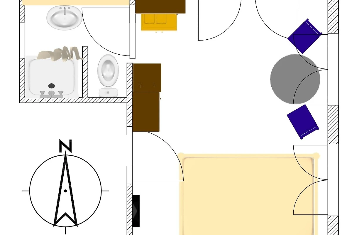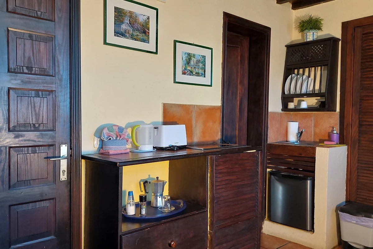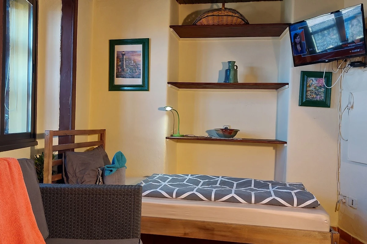 Dieses 15 m² kleine Studio mit Meerblick ist besonders für Einzelpersonen geeignet, die die meiste Zeit ihres Aufenthaltes die schöne Insel erkunden aber auch mal gerne eine Kleinigkeit im Zimmer kochen möchten. Es liegt im ersten Stockwerk zur Landstrasse (Mehrfachverglasung). Das 135 cm breite Bett ist für eine Person sehr grosszügig, zudem gibt es einen Tisch mit zwei bequemen Stühlen. Der Einbauschrank bietet genügend Platz für die mitgebrachte Kleidung. In der Kochnische können einfache Gerichte zubereitet werden. Das separate Badezimmer ist mit einer Dusche ausgestattet. Natürlich kann die grosse Gemeinschafts-Dachterrasse jederzeit genutzt werden. Der Flachbildfernseher verfügt über Satellitenempfang mit ca. 450 internationalen Sendern- darunter alle frei empfangbaren deutschen Kanäle - sowie durch Umschalten auf der Fernbedienung über DVB-T-Empfang mit den gängigen spanischen Fernsehsendern. Zudem kann auf Anfrage kostenlos Netflix bereitgestellt werden. Unser Haus verfügt über Internetanschluss per Glasfaser und in allen Unterkünften sowie auf der Dachterrasse steht sehr gut funktionierendes W-LAN zur kostenlosen Verfügung.