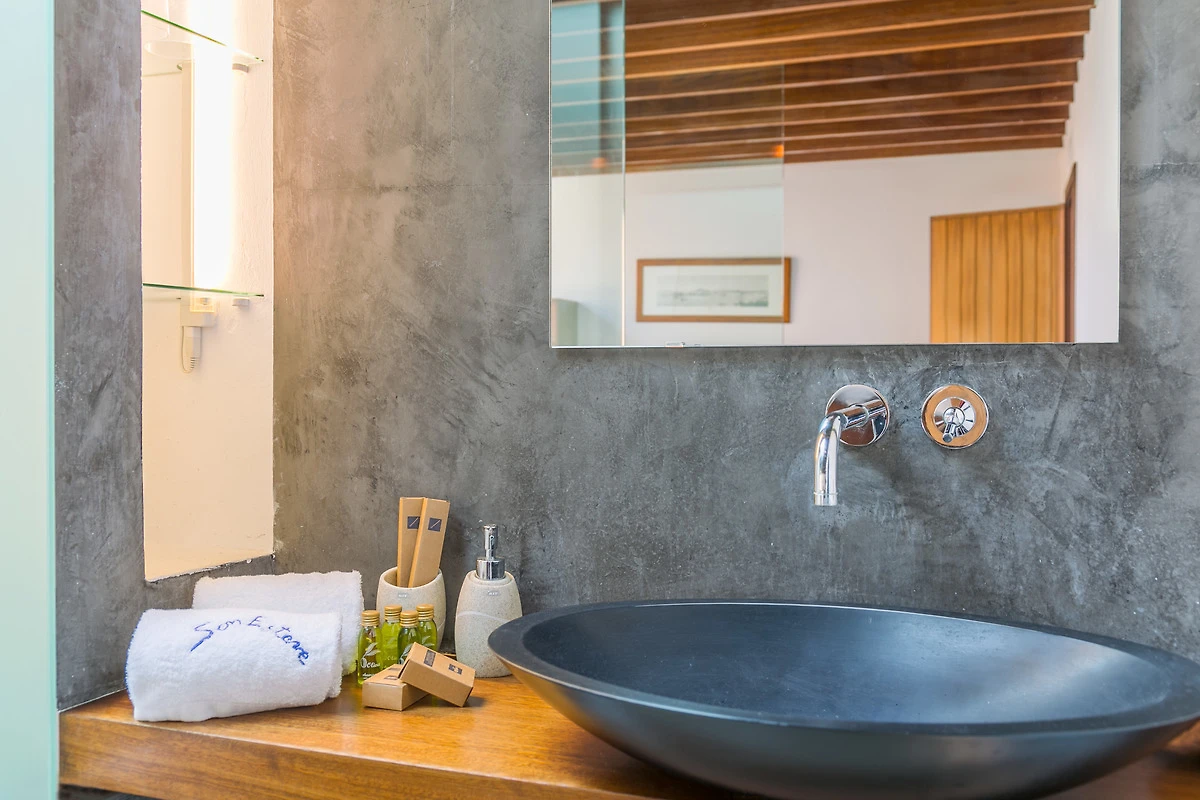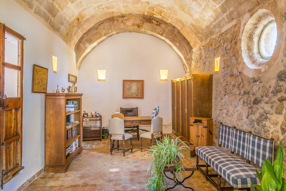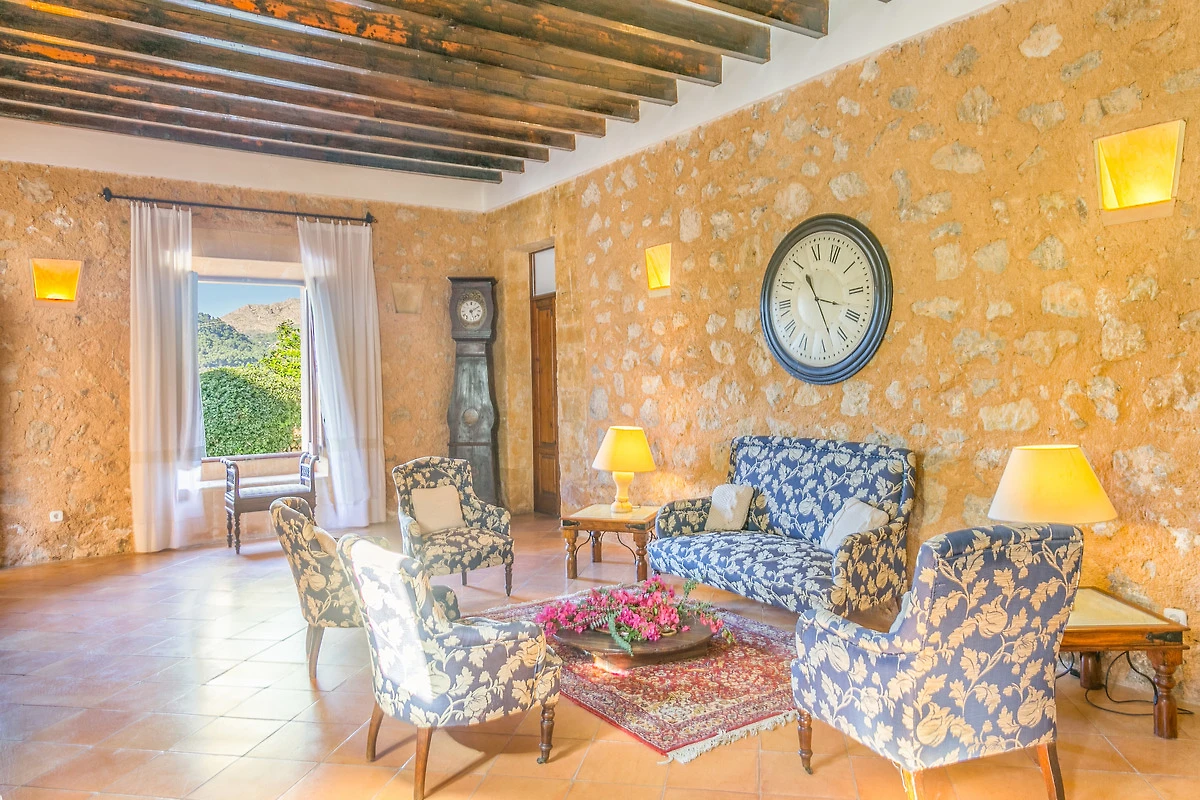 Son Esteve has a large and spacious interior, various lounge areas, one with an open fireplace. You can enjoy dining inside at the main table or there are other dining options outside.