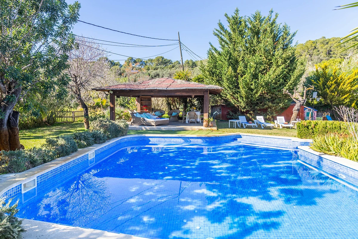 A pretty family house with a good size pool and the covered pergola area to dine or relax looking over the pool and landscaped gardens.
