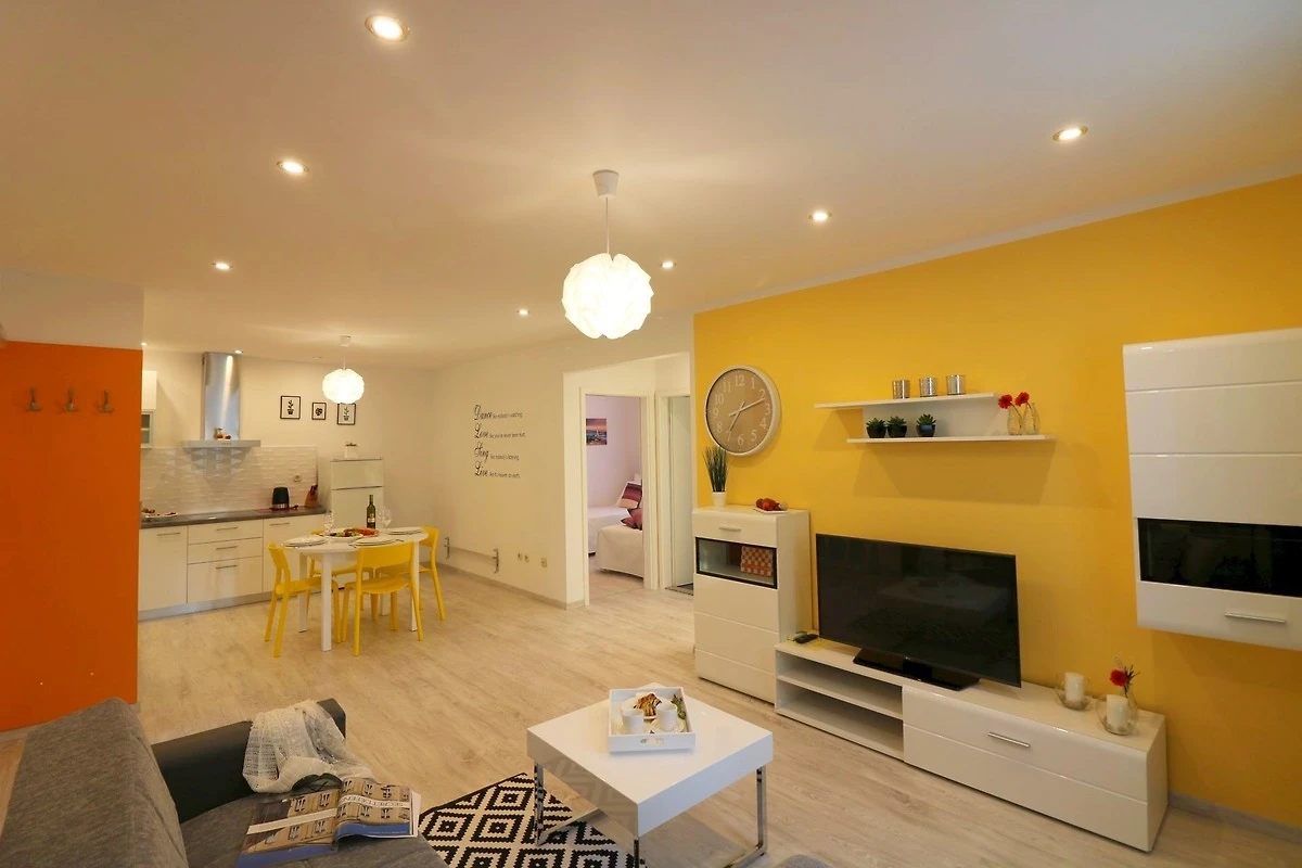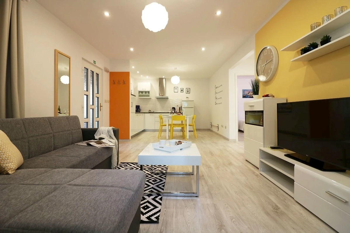 Schön und modern eingerichtet: Wohn -/ Esszimmer mit 1 Diwan , SAT-TV, Klimaanlage, Ausgang zum Garten und zur Terrasse.