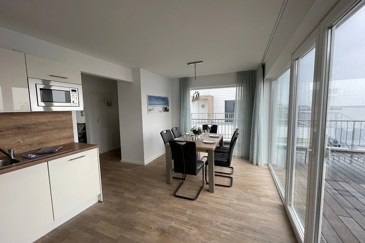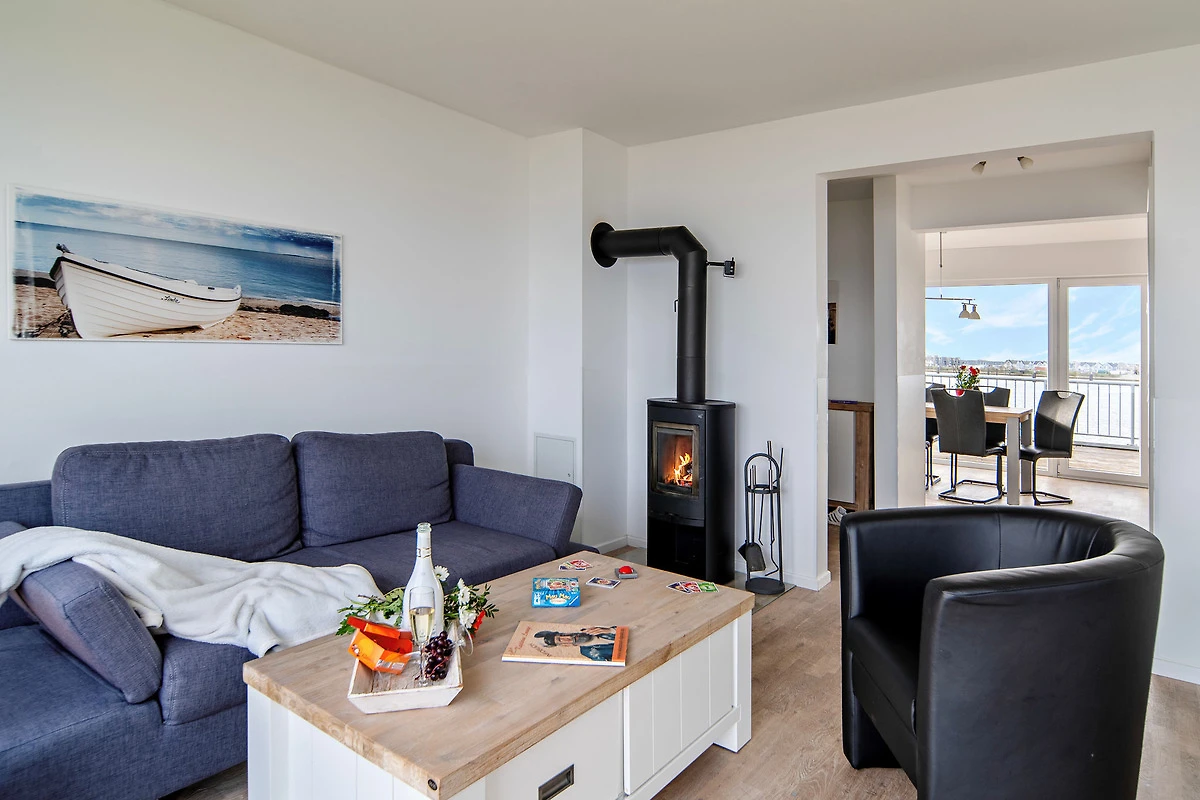 Der Blick dieser exclusiven 3-Zi-Ferienwohnung "Kaptein's Lounge" ist wirklich unbeschreiblich! Auf der Eingangsebene befinden sich Wohnbereich mit Kamin, Esszimmer mit grosszügiger Einbauküche, Panorama-Süd-Terrasse sowie Gäste-WC mit Dusche, im Obergeschoss 2 Schlafzimmer mit hochwertigen Boxspring-Doppelbetten sowie ein Wellness-Bad mit Whirlpool, Dusche und (Infrarot-) SAUNA!