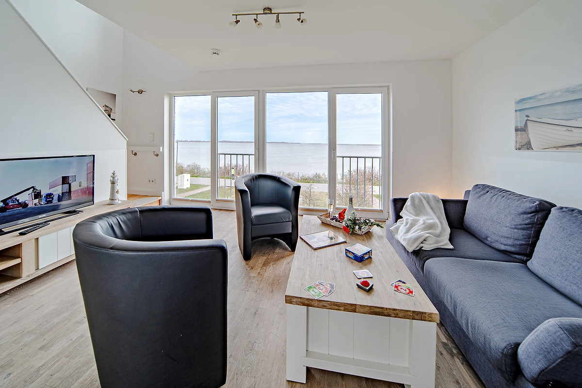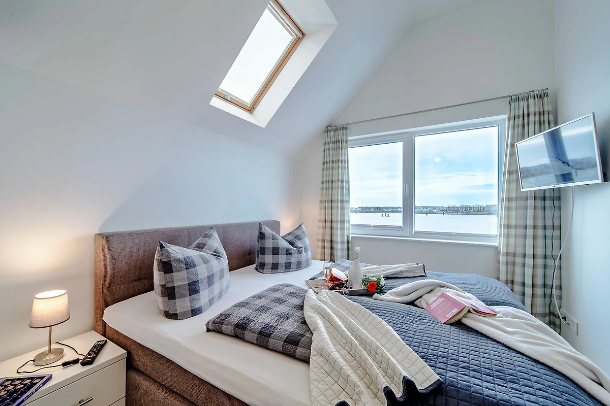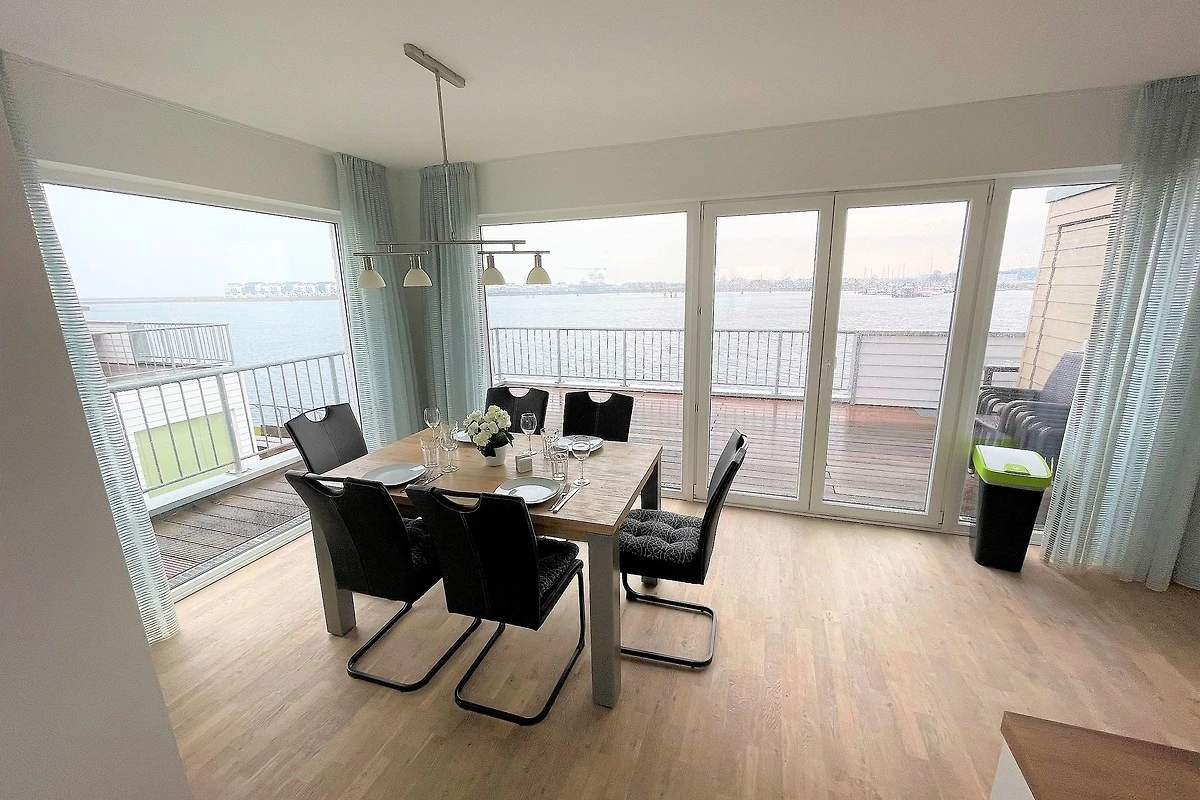 Mehr Wasserblick geht nicht: 180 Grad-Panorama-Blick auf den Hafen von Port Olpenitz im Süden sowie auf die Schlei mit den vielen vorbeifahrenden Segelschiffen, Maasholm und Schleimünde im Norden... Hier fühlen Sie sich fast wie auf der "Kommandobrücke" eines (Kreuz-)Schiffs!