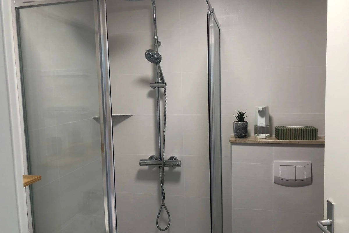 Im Bad, ausgestattet mit WC, Waschbecken und Dusche, stehen unseren Gästen auch ein Haartrockner, Handwaschseife und Kosmetiktücher zur Verfügung.
