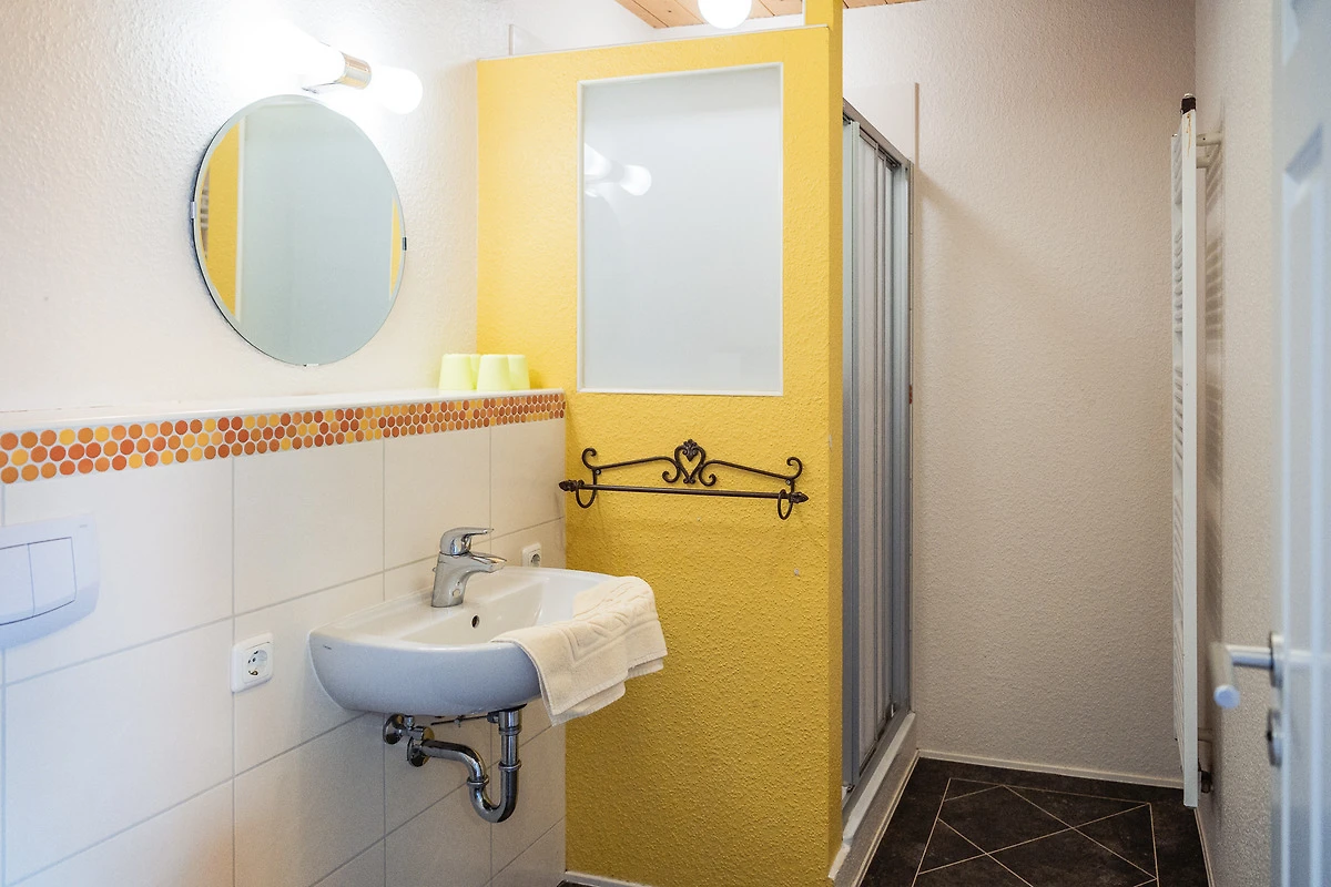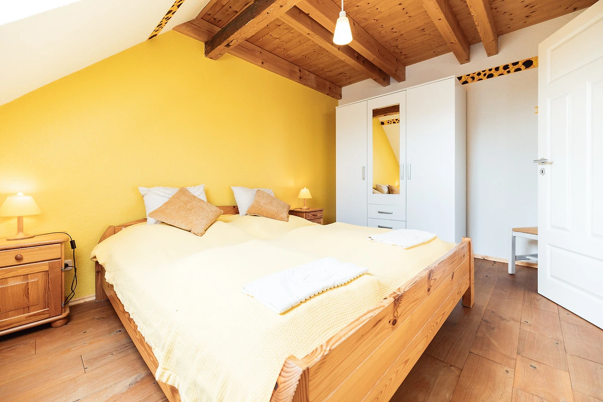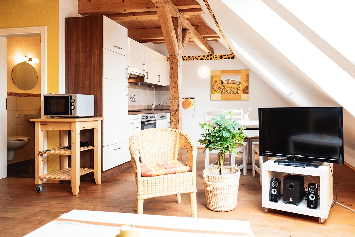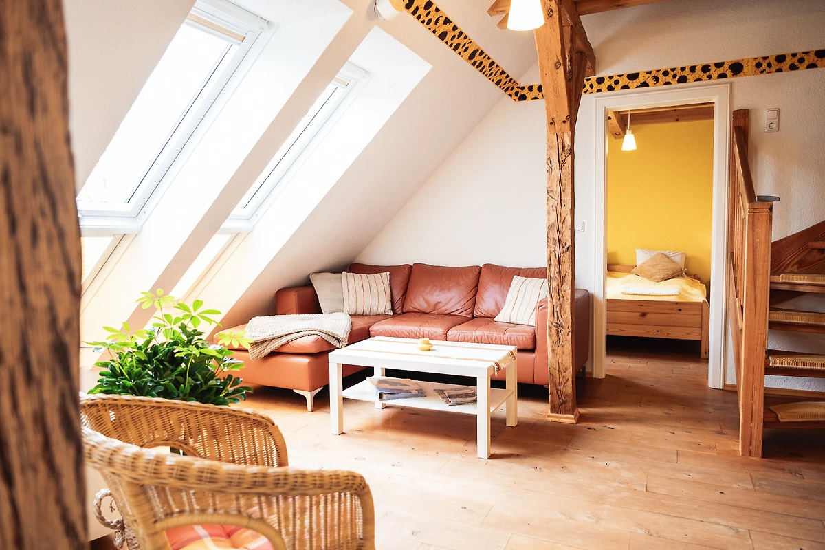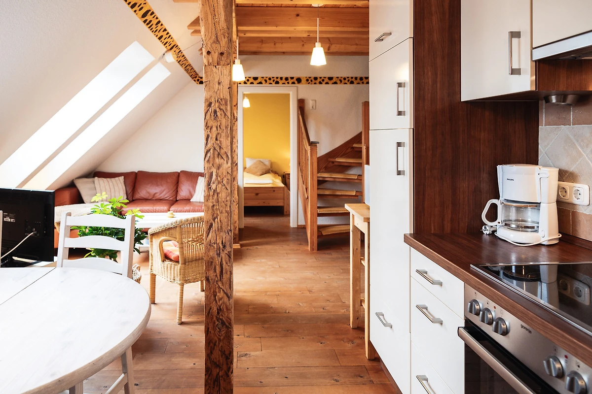 Unsere schöne Ferienwohnung "Sonnenblume" liegt im 1 OG des alten Bauernhauses. Die Wohnung besitzt 2 Schlafräume, einen Wohn-/Essbereich mit Küchenzeile und ein Duschbad. Die Küche ist komplett ausgestattet mit allem, was es für einen erholsamen Urlaub benötigt. Waschmaschine und Trockner können kostenpflichtig bei uns mitbenutzt werden.