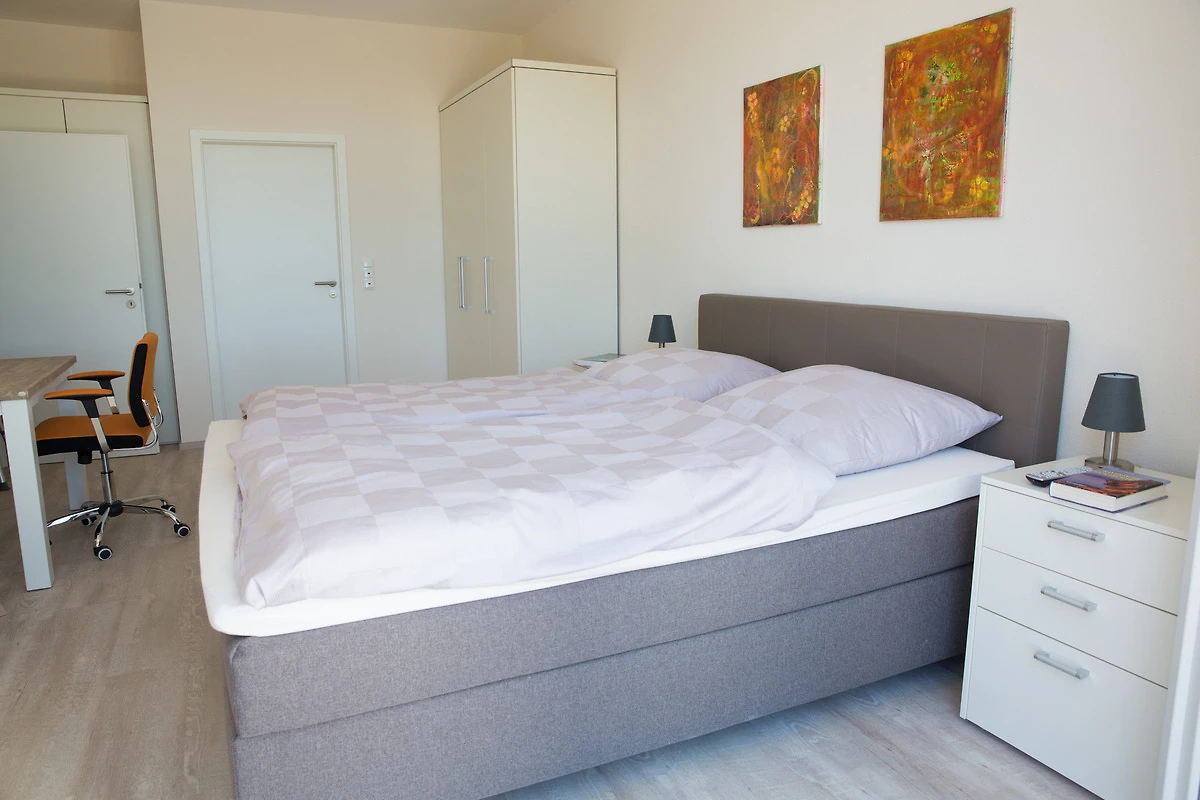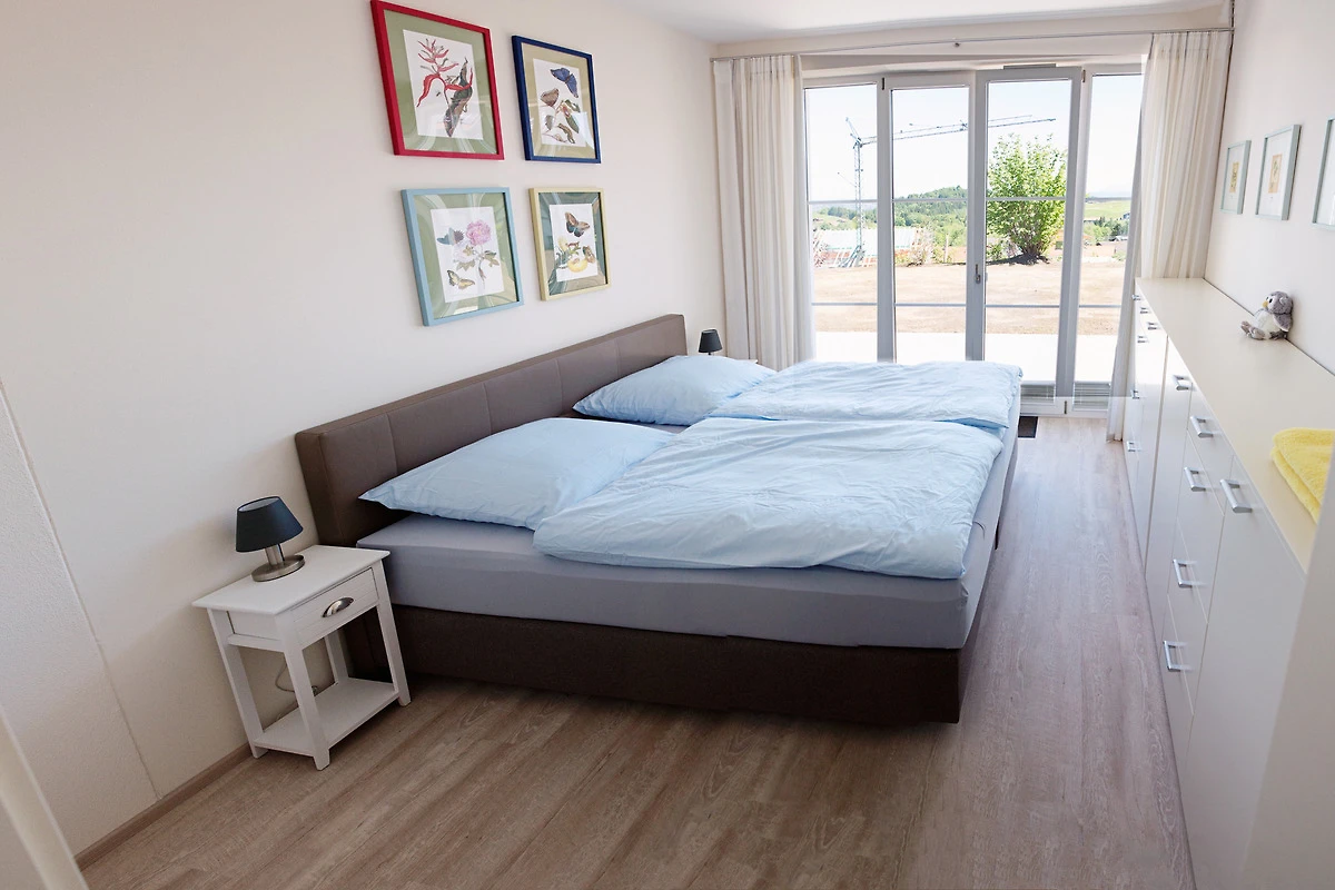 Beide Schlafzimmer sind mit sehr bequemen Boxspringbetten und Schränken mit viel Stauraum ausgestattet. Im grösseren der beiden Zimmer befindet sich auch ein Schreibtisch, ein weiterer Fernseher und der Zugang zu einem der beiden Badezimmer.