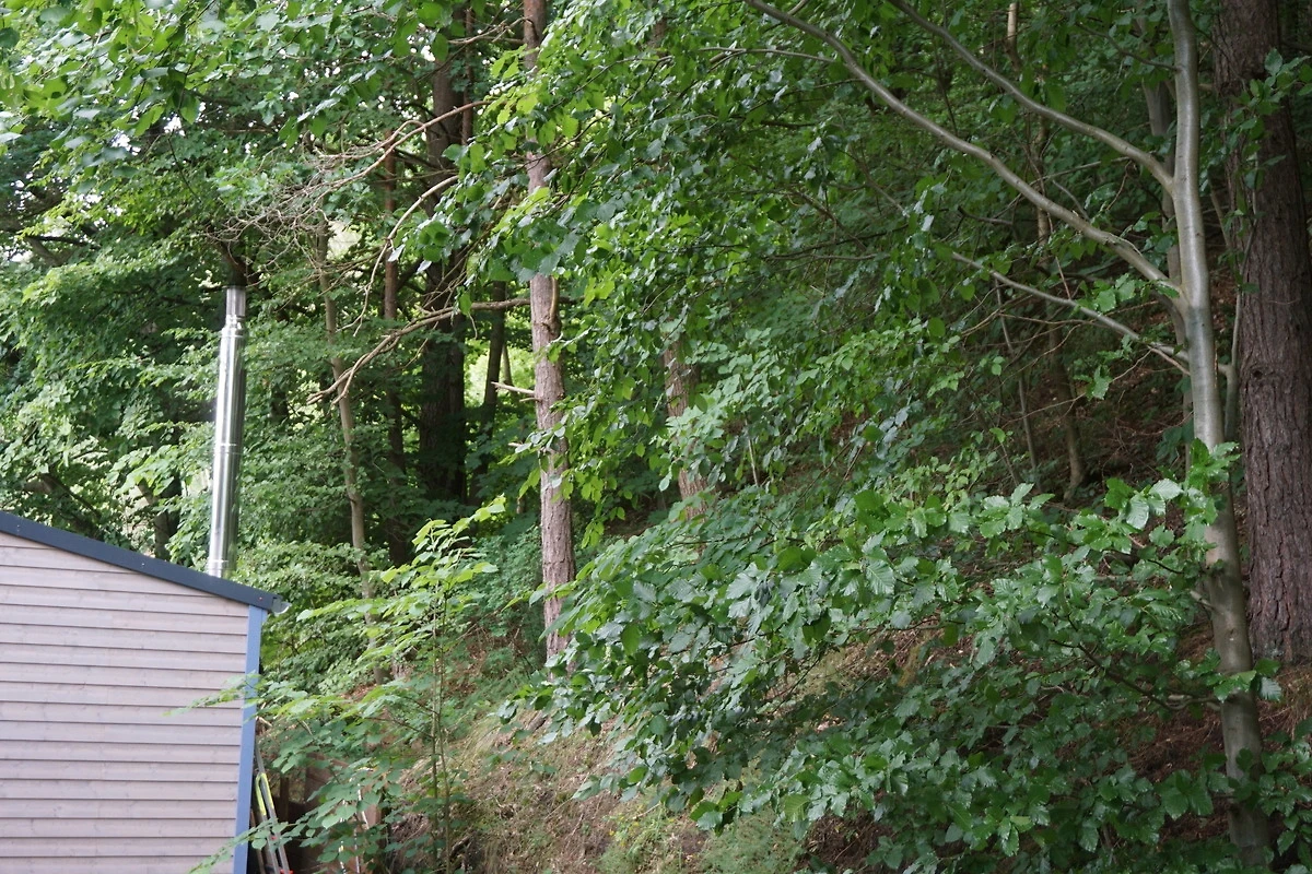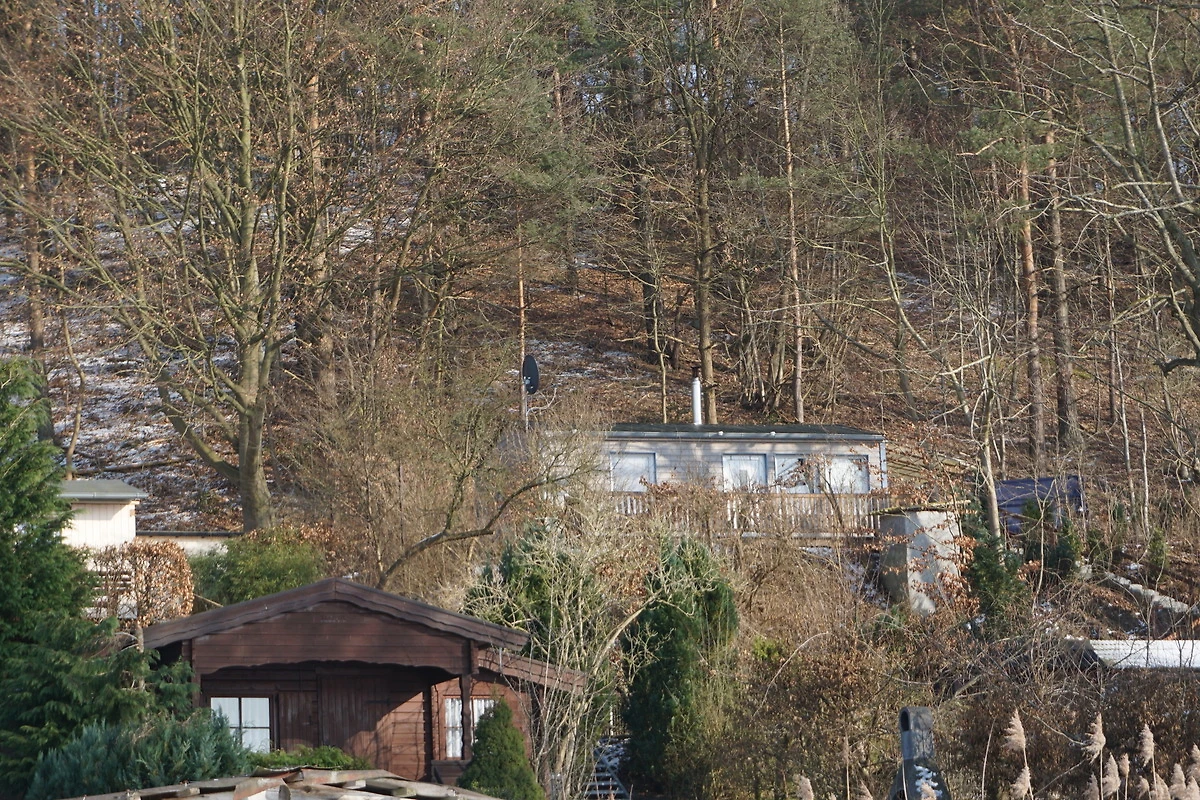 Der Bungalow liegt an einem Hang und ist über ca. 15 Stufen erreichbar .