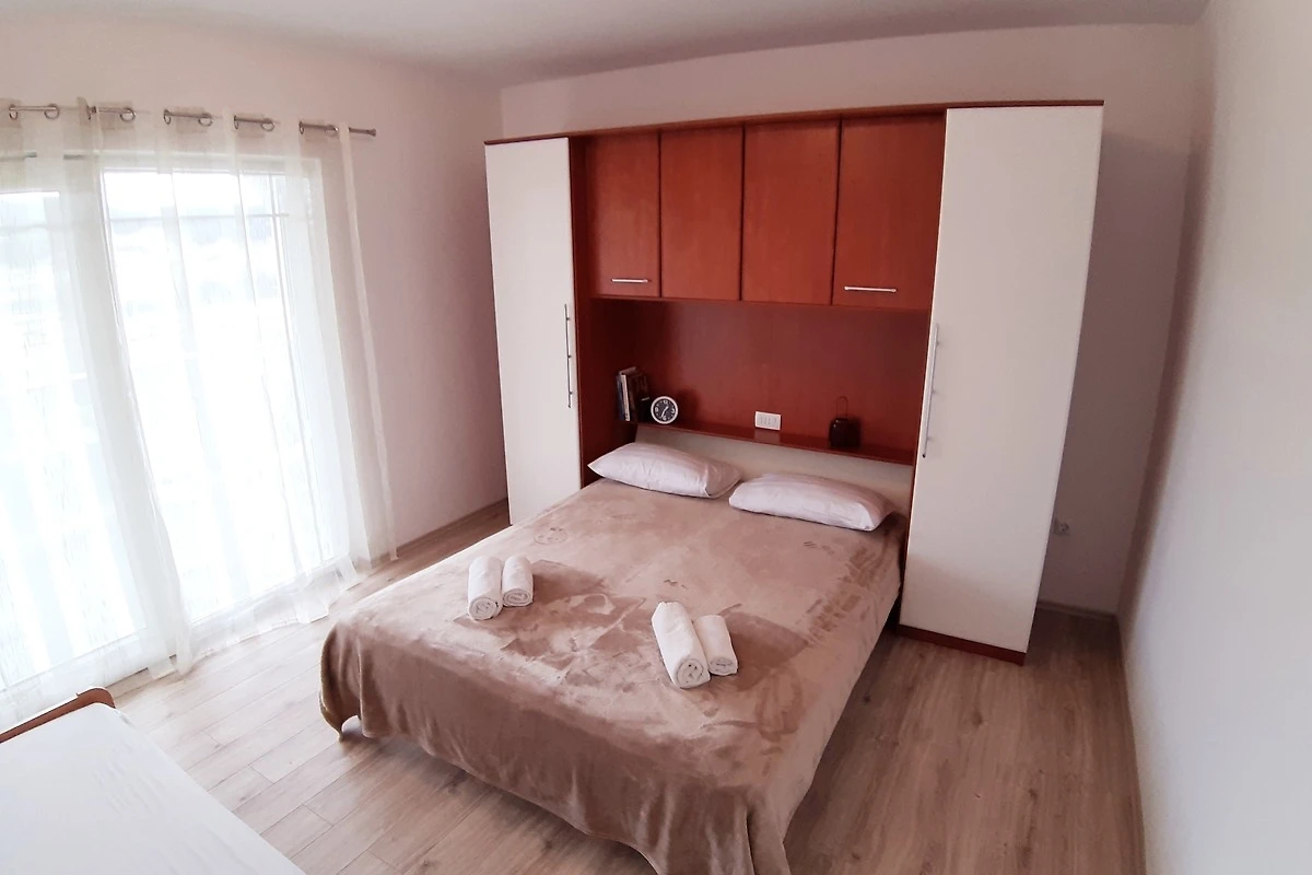 Die Ferienwohnung liegt auf der ersten Etage und bietet fünf Personen eine Wohnfläche von 60m². Sie verfügt über zwei Schlafzimmer mit jeweils einem Doppelbett und ein Zusatzbett ist auch vorhanden. Die Wohnküche und ein Schlafzimmer führen auf den Balkon. Die Kochnische ist komplett ausgestattet und eine Essecke sowie ein Fernseher mit Sat.-TV stehen auch in der Wohnküche bereit. Eine Badezimmer mit Dusche.