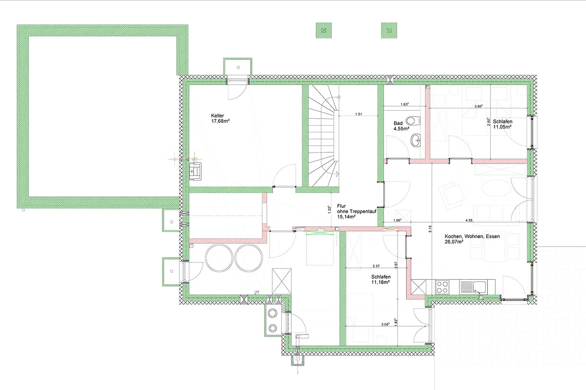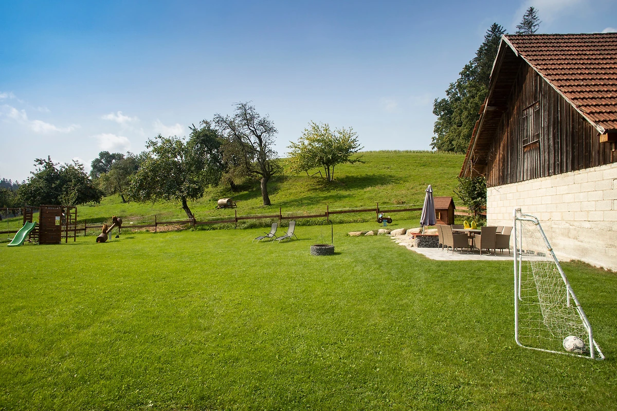 Auch die Aussenanlage ist bereits grösstenteils fertiggestellt - der Rasen mit Trampolin und Fussballtoren sowie die Terrassen sind angelegt. Bis Ostern 2019 werden die Parkplätze ausserdem noch gepflaster. Weitere Spielgeräte und ein fester Grillplatz erfolgen bis zu den Pfingstferien 2019 (ein mobiler Grill ist bereits vorhanden).