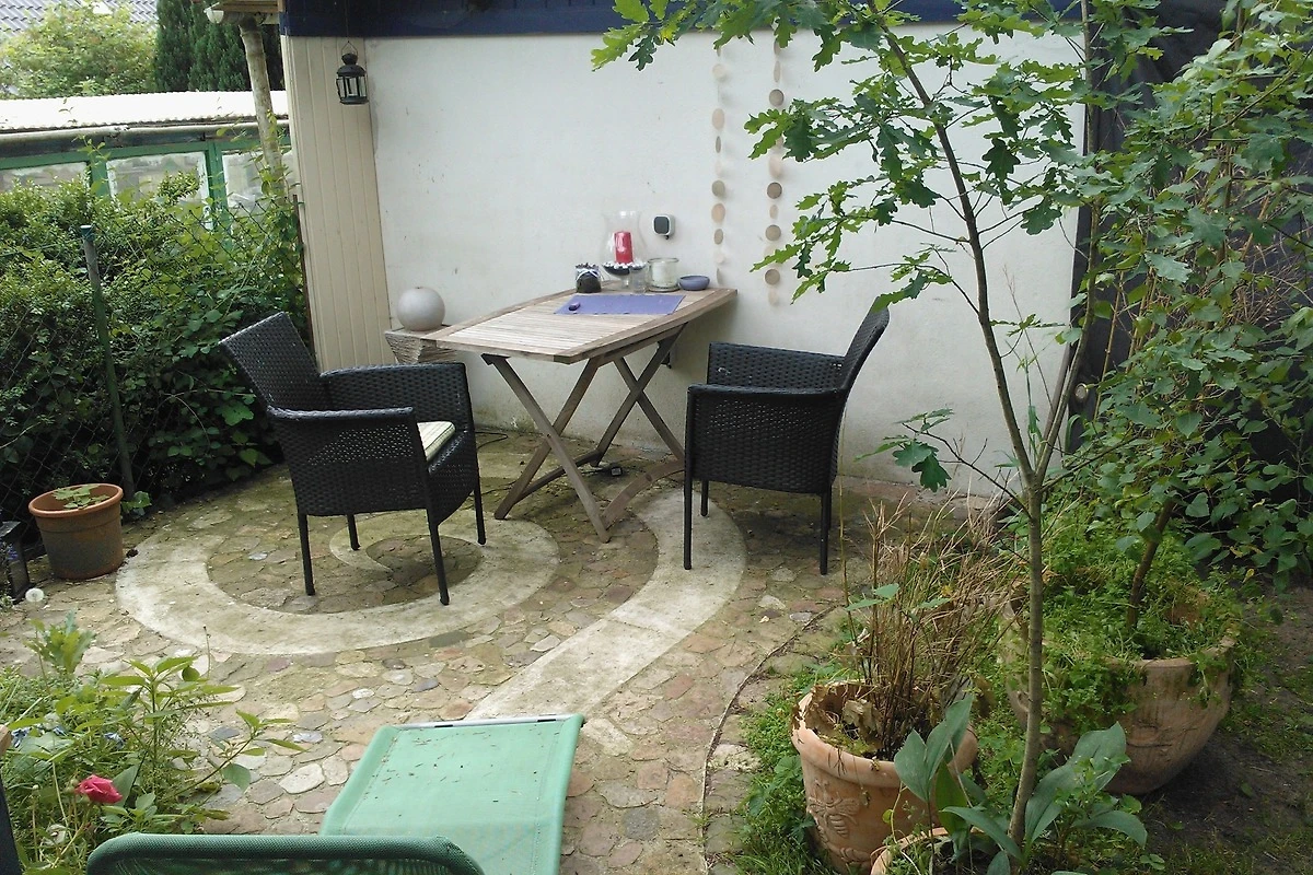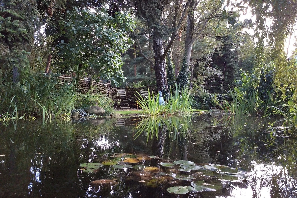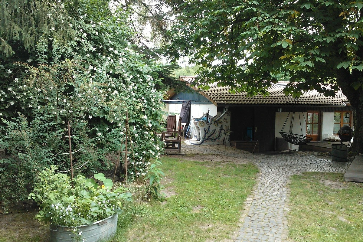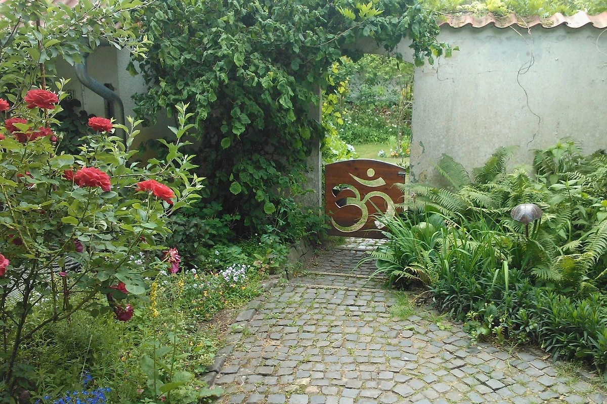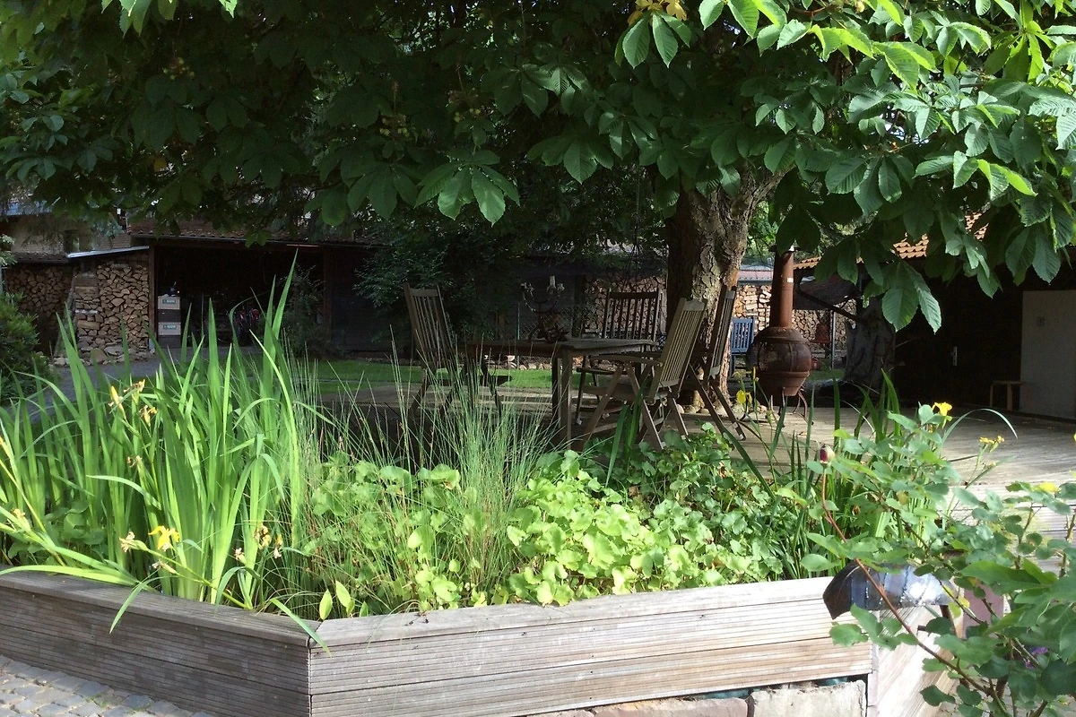 Unser 1.700 m² grosses Grundstück hat einen Innenhof, in dem sich eine grosse Kastanien hoch und breit macht. Hier liegt auch der Eingang zum Studio. Durch einen Torbogen gelangen sie in einen grossen naturnahen Garten mit Blumen, Bäumen, Büschen und einem grossen und bewohnten Schwimmteich sowie unterschiedlichen Sitzplätzen.
