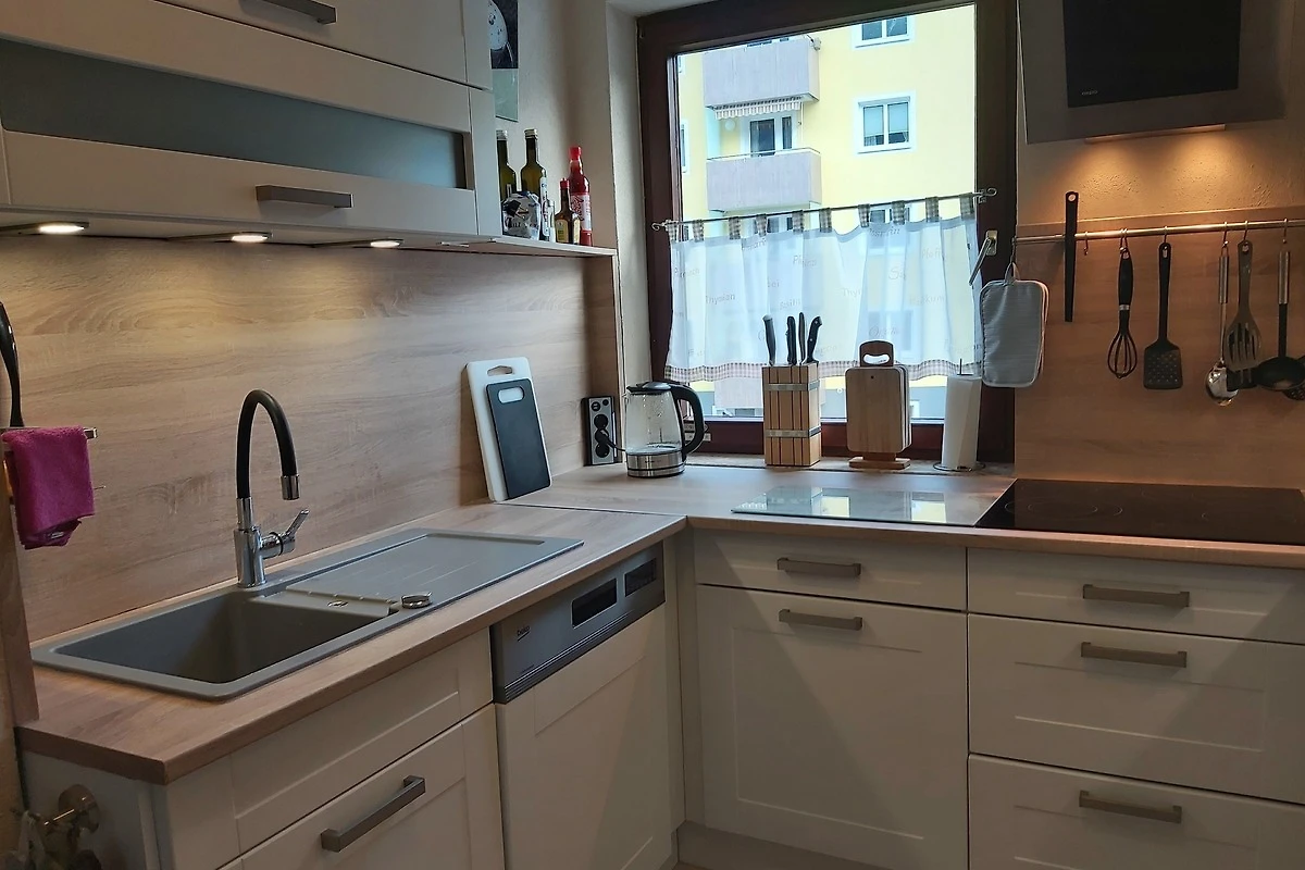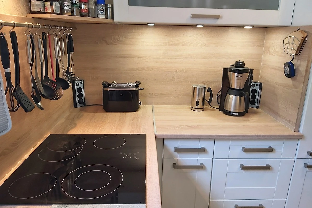 In der komplett ausgestatteten Küche finden Sie ein Ceranfeld,Backofen,Kühlschrank,Spülmaschine,Mikrowelle,Kaffeemaschine,Toaster und Wasserkocher
