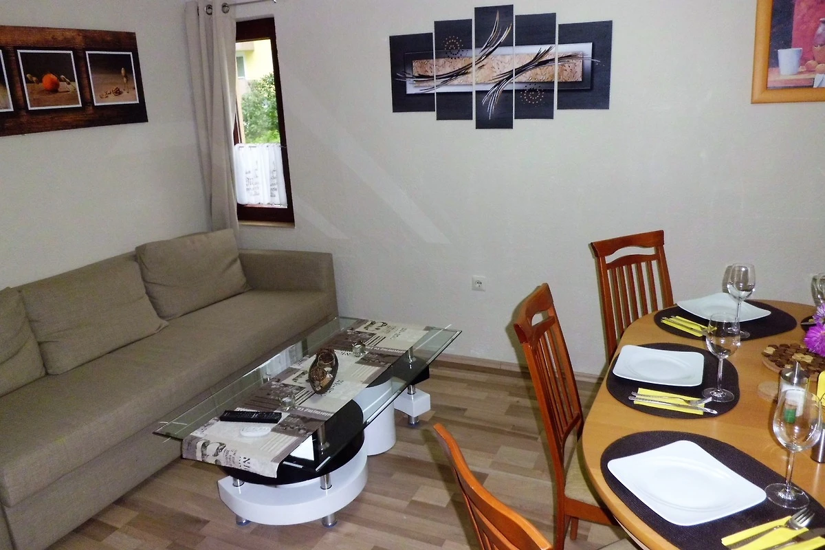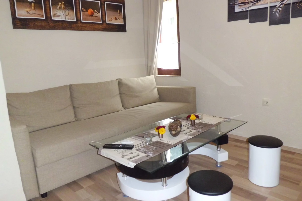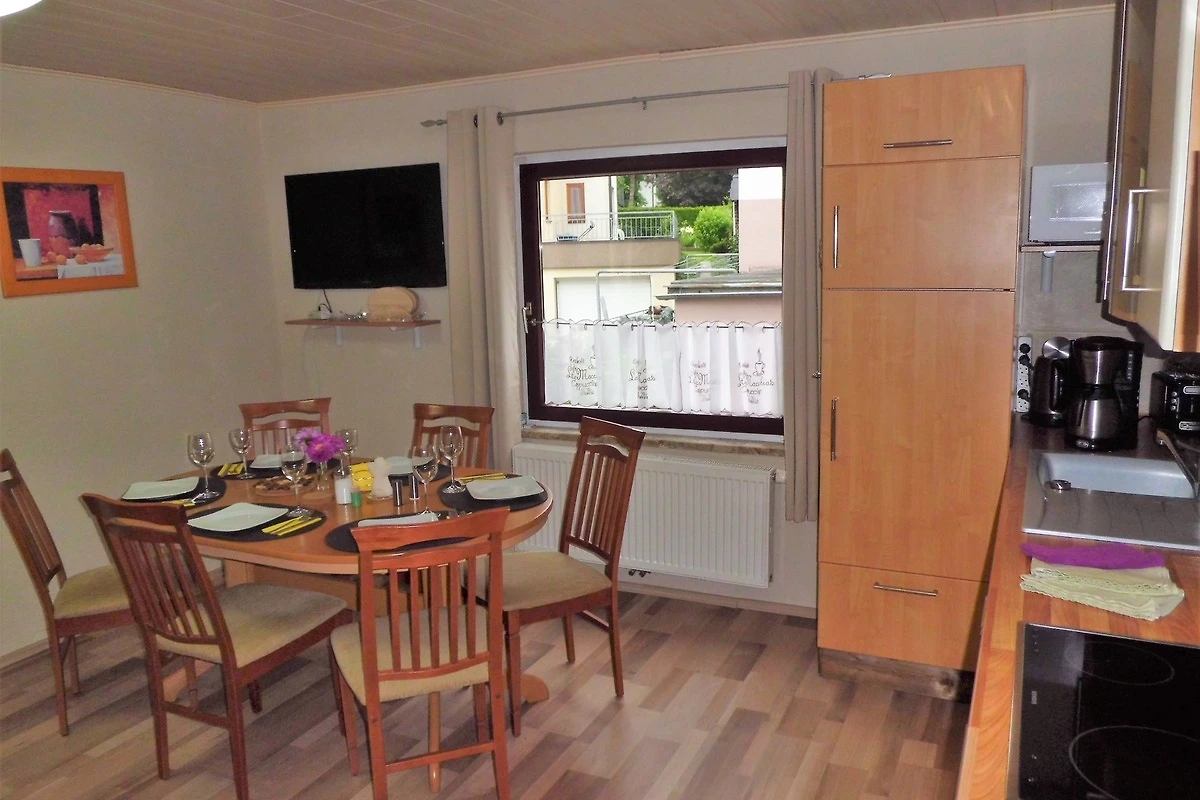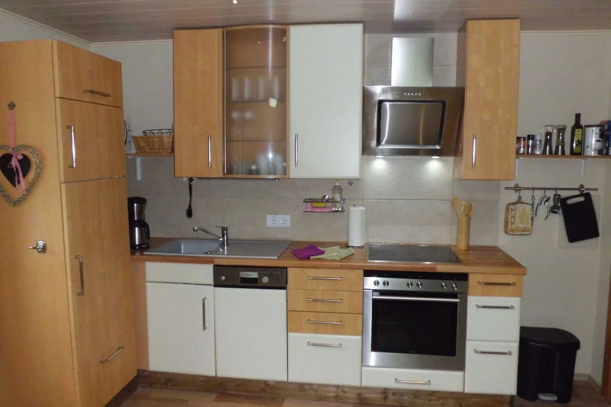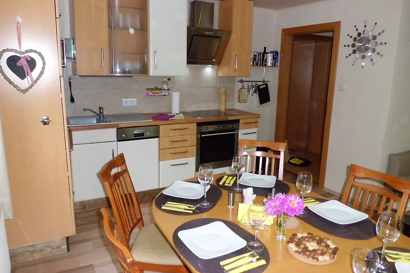 In der Wohnküche finden Sie eine grosse moderne Küchenzeile mit einer kompletten Ausstattung,Ceranfeld,Backofen,Kühl- Gefrierkombi,Kaffeemaschine,Toaster,Wasserkocher und Mikrowelle. Eine schöne Wohnlandschaft mit Schlafcouch ( 1,40 m breit ), einem grossen Essbereich und natürlich einem Fernseher lädt zum verweilen ein.