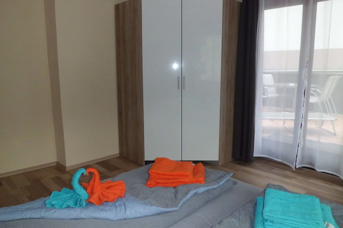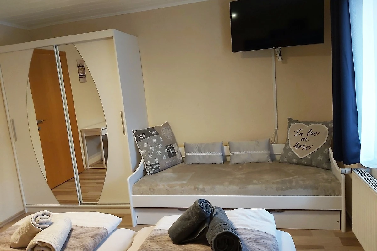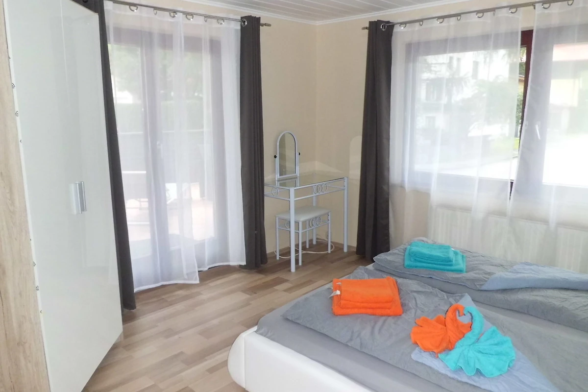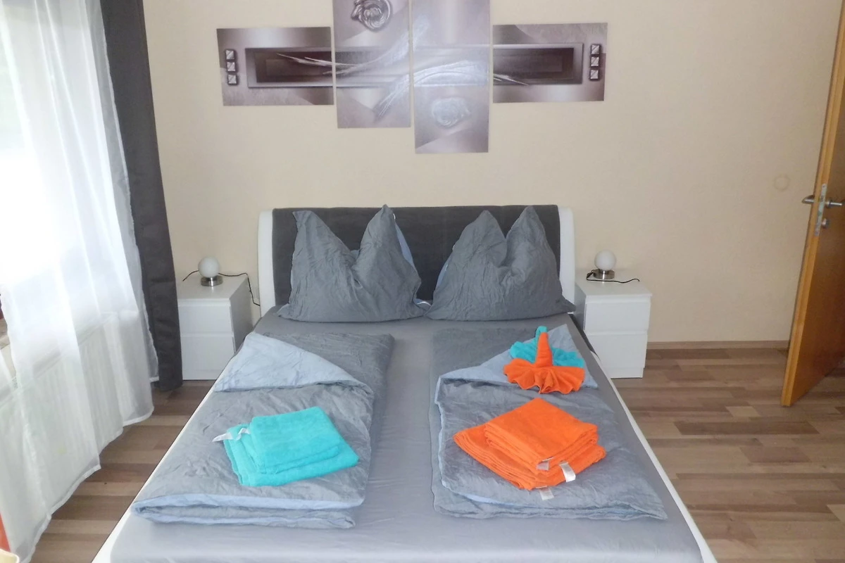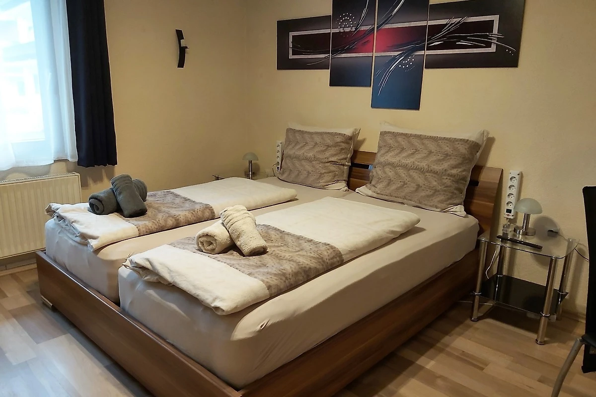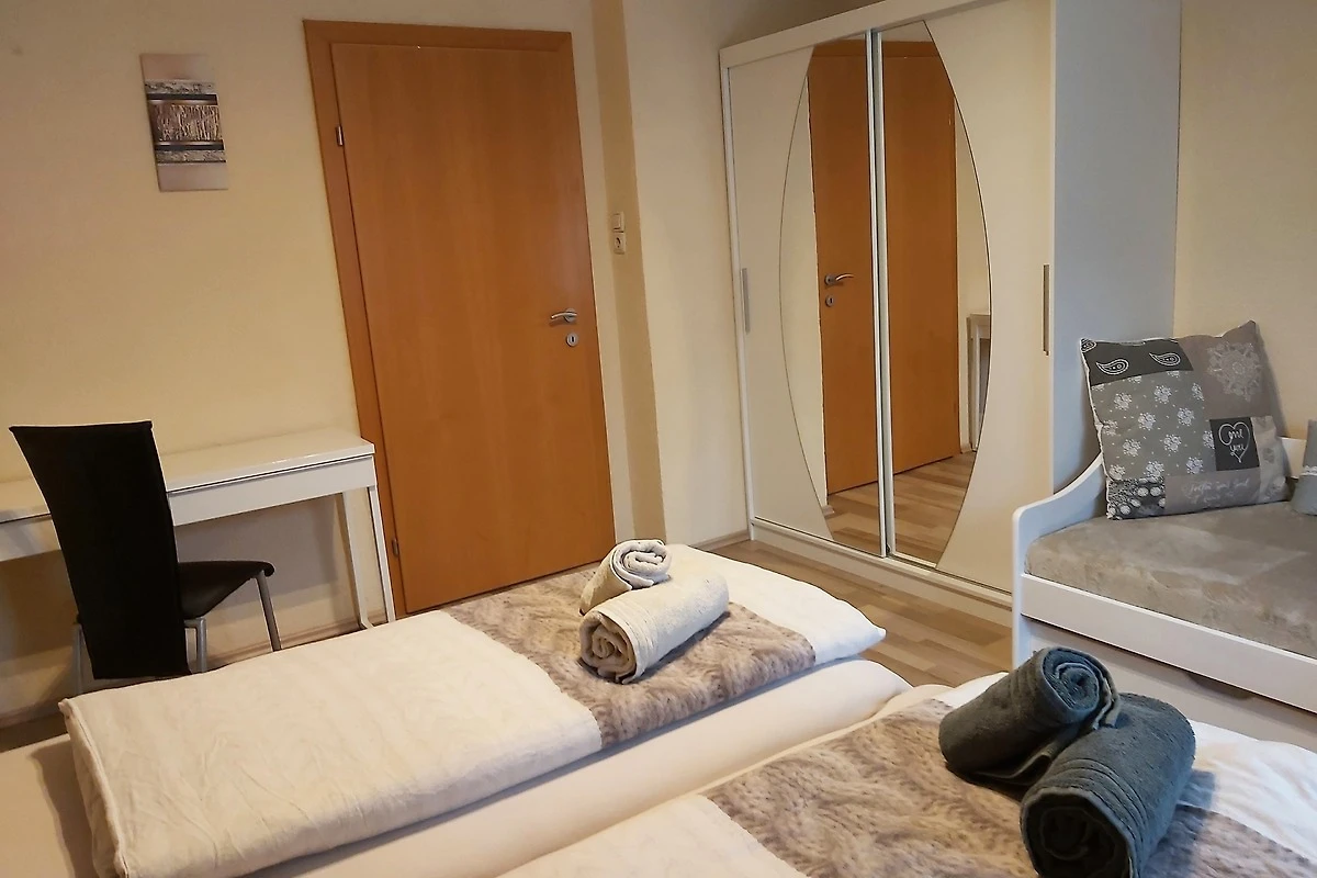 Die 2 Schlafzimmer sind mit Doppelbetten, Kleiderschrank, Herrendiener und Fernseher ausgestattet. Ein Schlafzimmer verfügt zudem über einen Schreibtisch, das andere über einen Schminktisch.