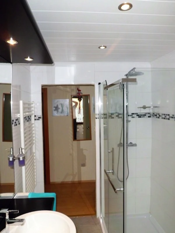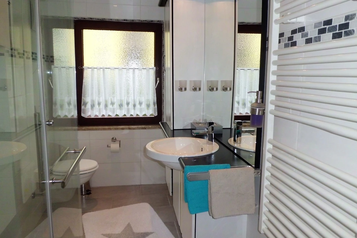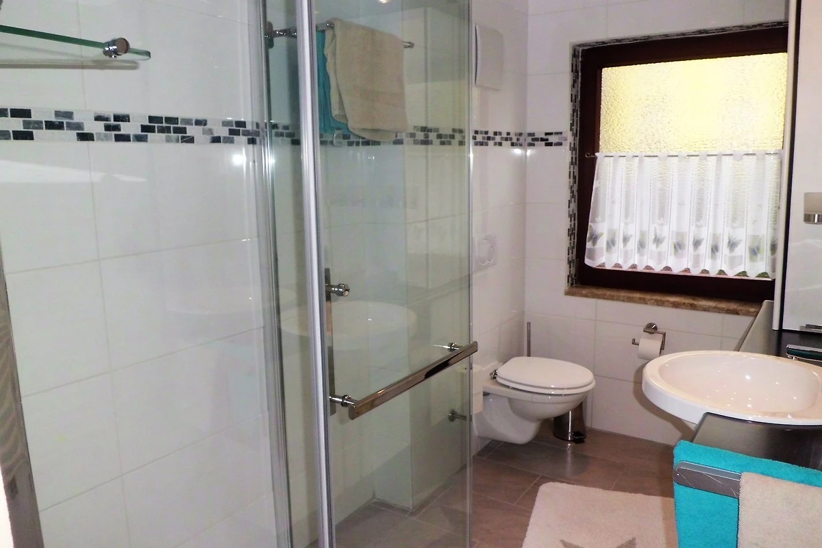 Das Bad ist sehr modern gehalten und hat eine grosse Dusche, sowie eine schöne Waschtischgarnitur und WC.
