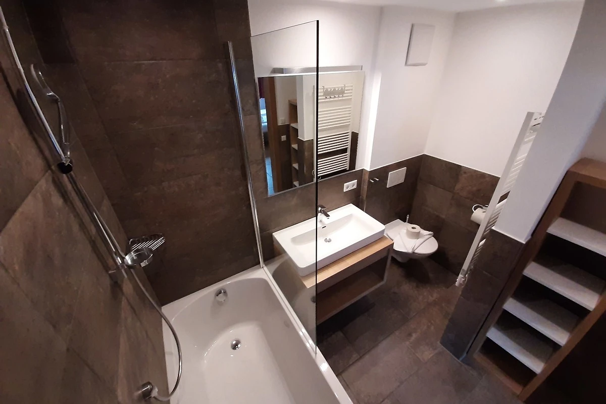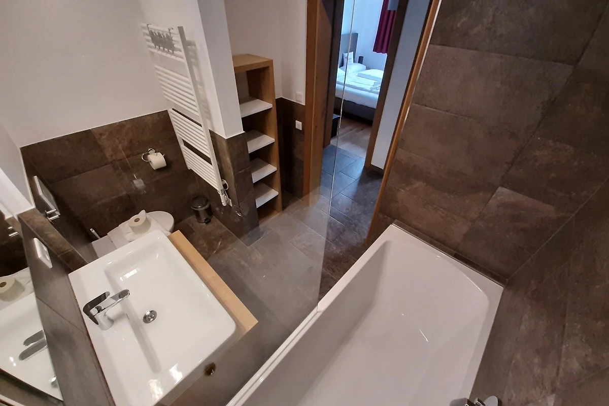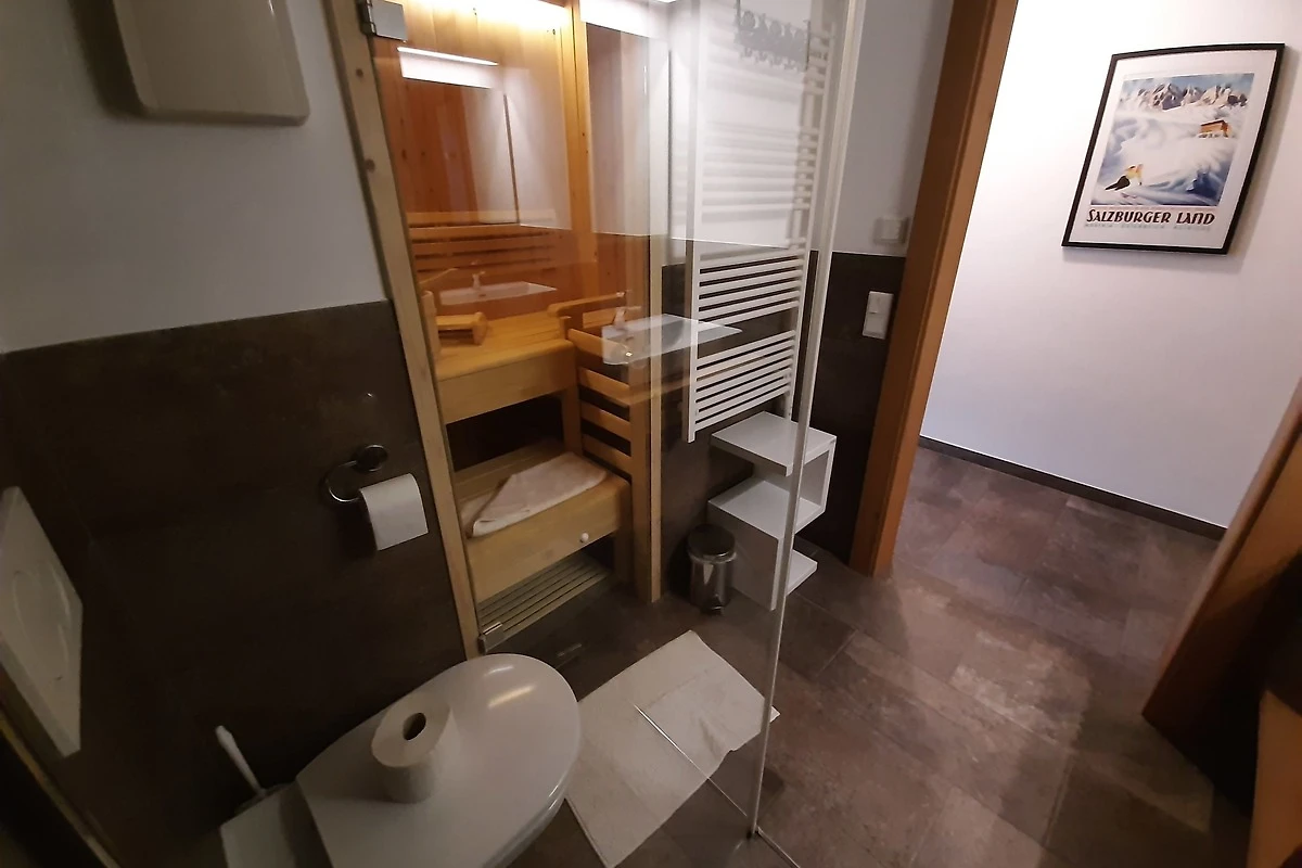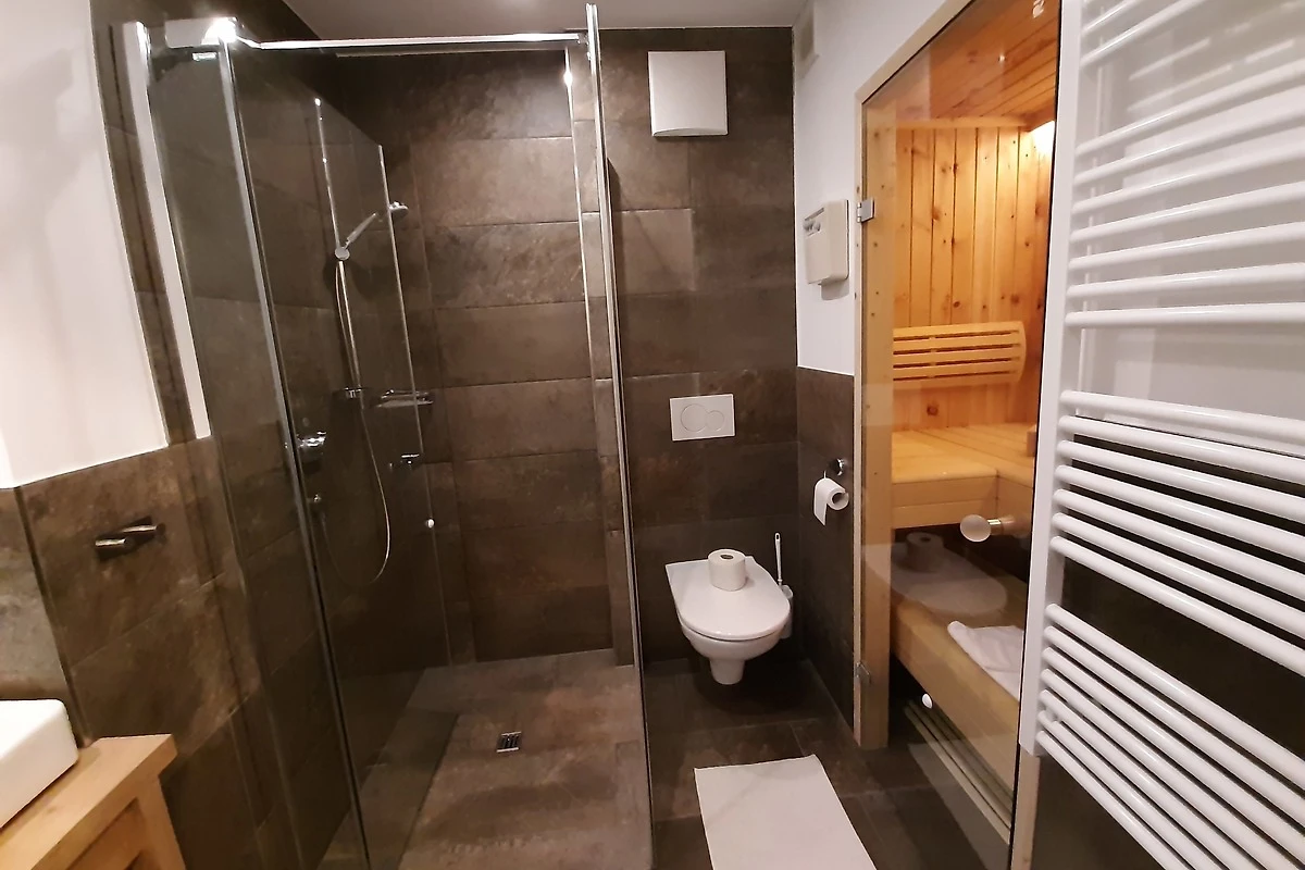In den beiden Badezimmern relaxen Sie entweder in der Badewanne oder im Aroma der ätherisch duftenden Zirbensauna. Oder Sie geniessen in der Früh oder nach dem Saunagang die grosszügige Walk In Dusche.