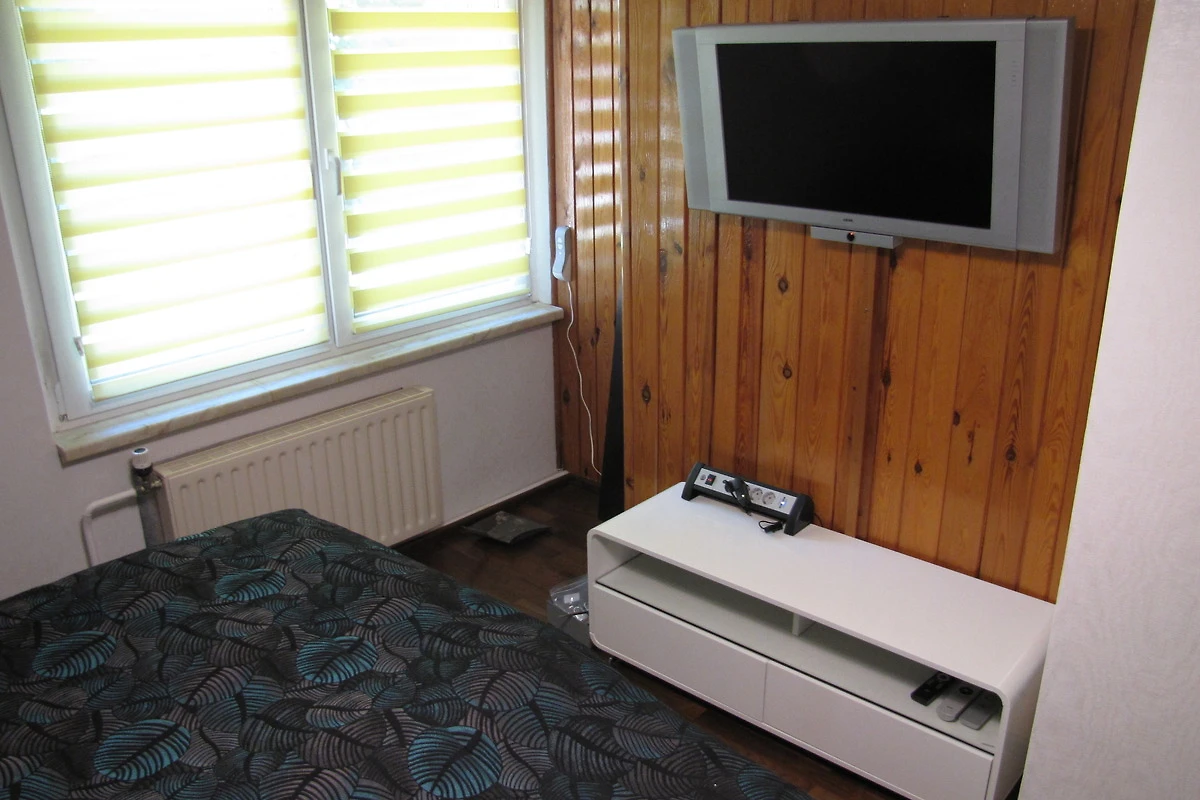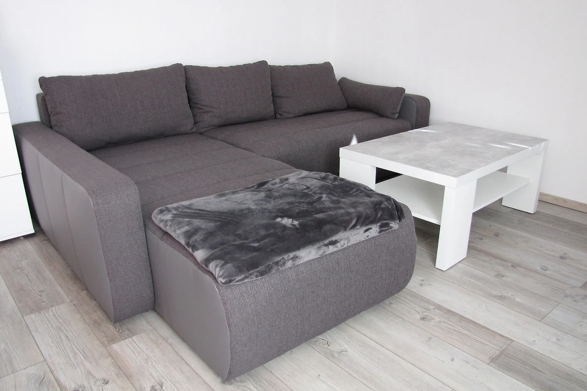 Das Wohnzimmer ist sehr geräumig und verfügt über eine Sitzgruppe und eine chillige Couch-Landschaft zum Entspannen (und nach Umwandlung in eine Schlafcouch auch zum Übernachten). Grossbild-TV mit BluRay-Player und Sat-TV steht Ihnen auch zur Verfügung. Im Wohnzimmer ist Laminat als Fussboden verlegt.