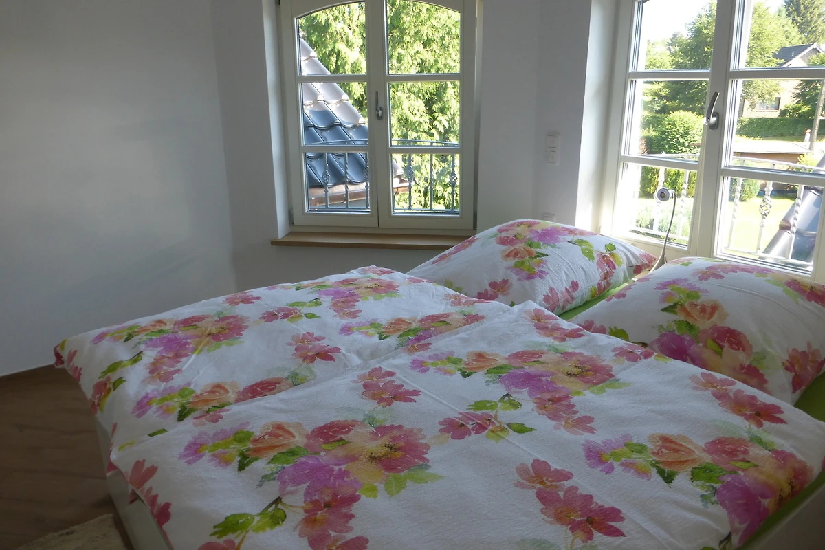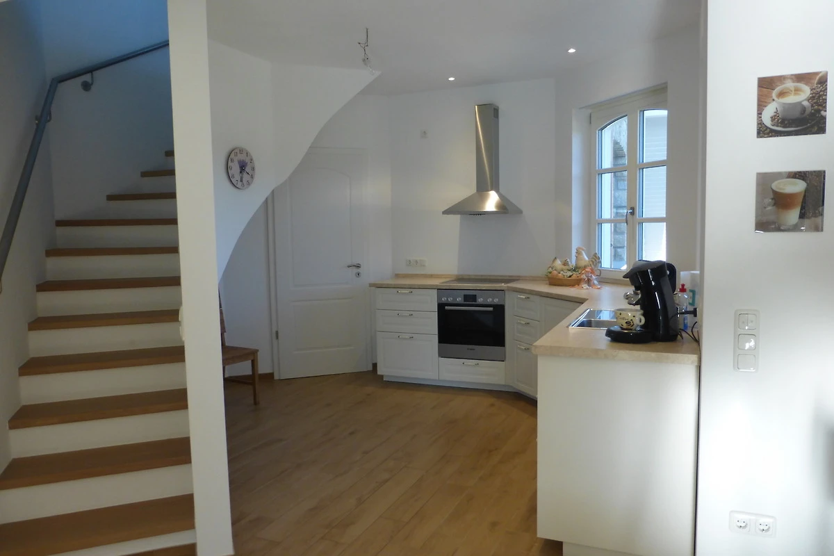 Zur Wohnung gehören 2 Türmchenzimmer: Das obere Türmchenzimmer ist eines der beiden Schlafzimmer und zeichnet sich aufgrund der Lage in der Spitze des Türmchens durch einen unverwechselbaren Weitblick aus. In dem anderen Türmchenzimmer befindet sich eine voll ausgestattete, gemütliche, neue Landhausküche mit Spülmaschine, Backofen, Herd, Kaffeemaschine, Kühlschrank mit Gefrierfach.