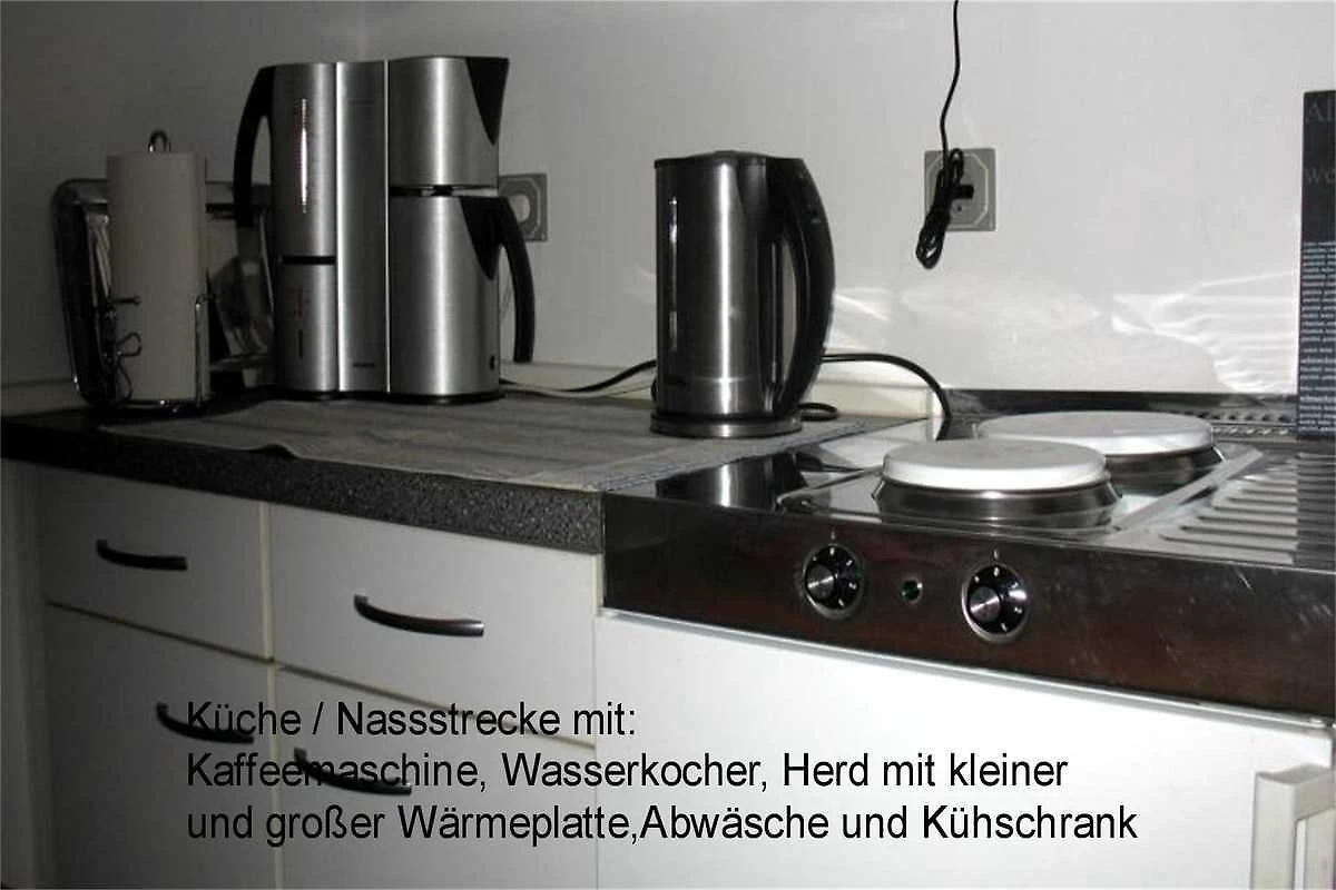 Die kleine Küche ist ausgestattet mit Geschirr, Töpfen und Pfannen, Kühlschrank, 2-Plattenherd, Kaffeemaschine, Wasserkocher, Mikrowelle, Toaster und mit einem kleinen Essplatz für 2 Personen.