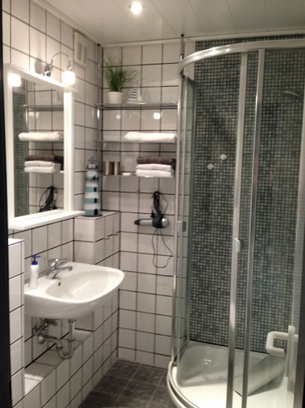 Im modernen Badezimmer finden Sie ein Hänge-WC, einen Fön und eine grosse Dusche.