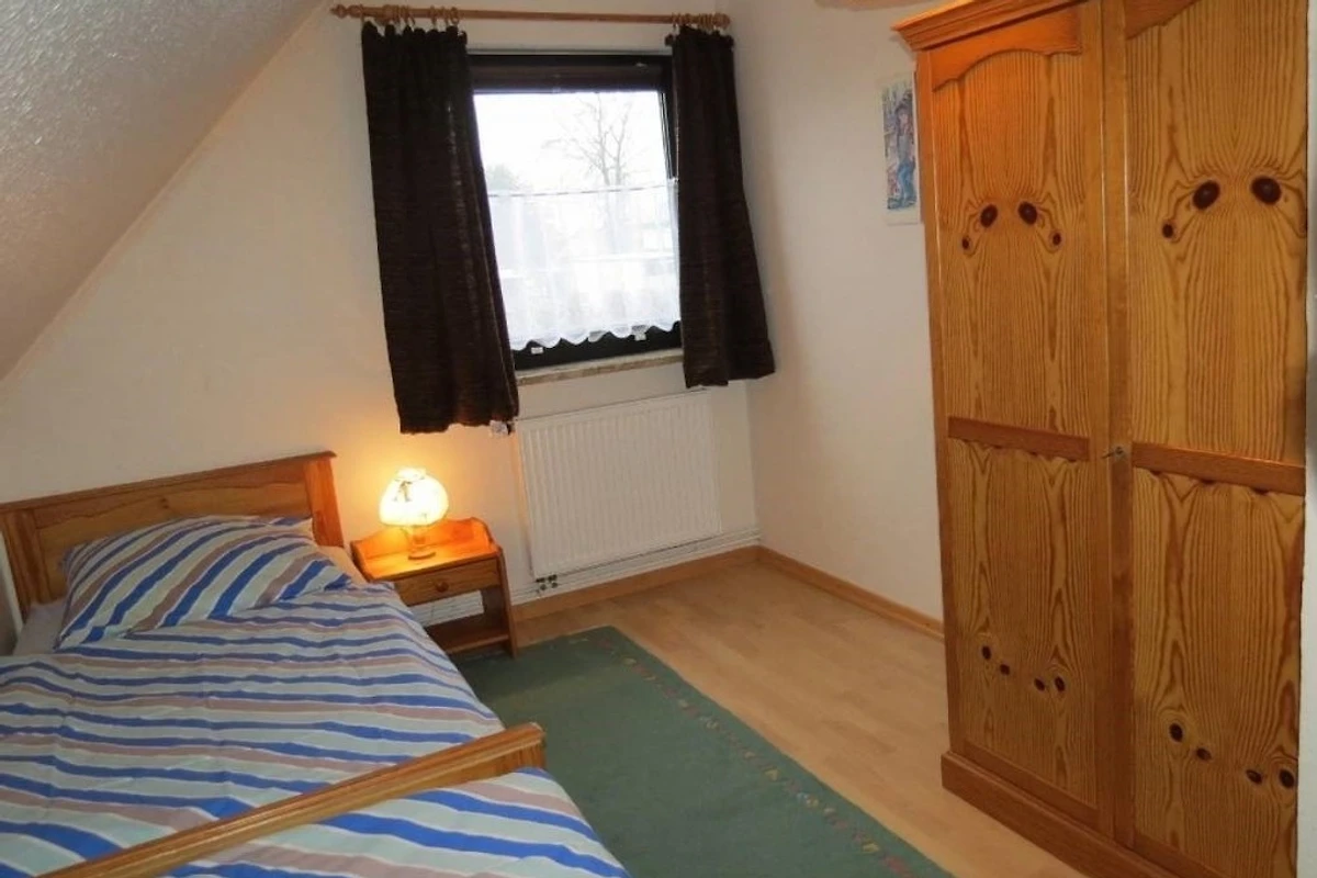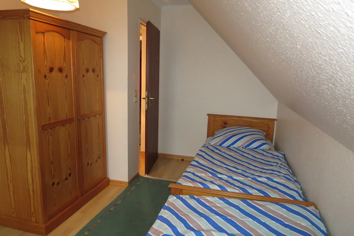Die Ferienwohnung hat 2 separate Schlafzimmer (jeweils ca. 10m²) mit jeweils 2 Einzelbetten (2m lang). Es stehen synthetische Bettdecken und Kopfkissen zur Verfügung.