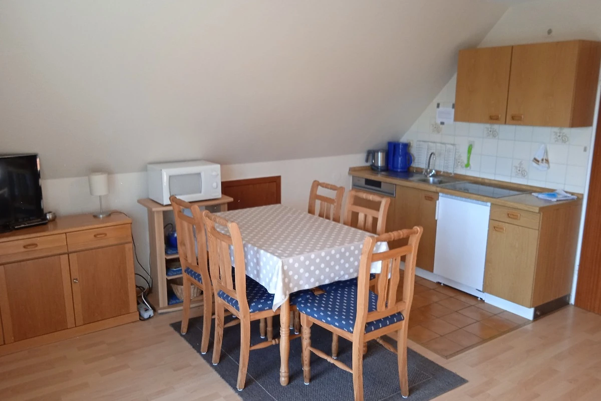 Es ist offen zu der Küchenzeile mit Geschirrspülmaschine, Mikrowelle, Cerankochfeld, Kühlschrank mit Gefrierfach, Kaffeemaschine, Wasserkocher, Toaster, Mixer, Eierkocher und Geschirr. Die Wohnung verfügt über ein Duschbad mit Dachfenster.