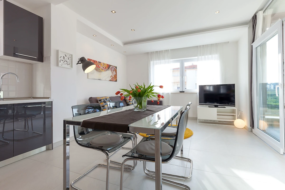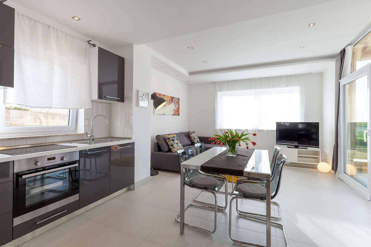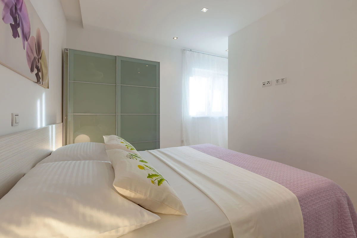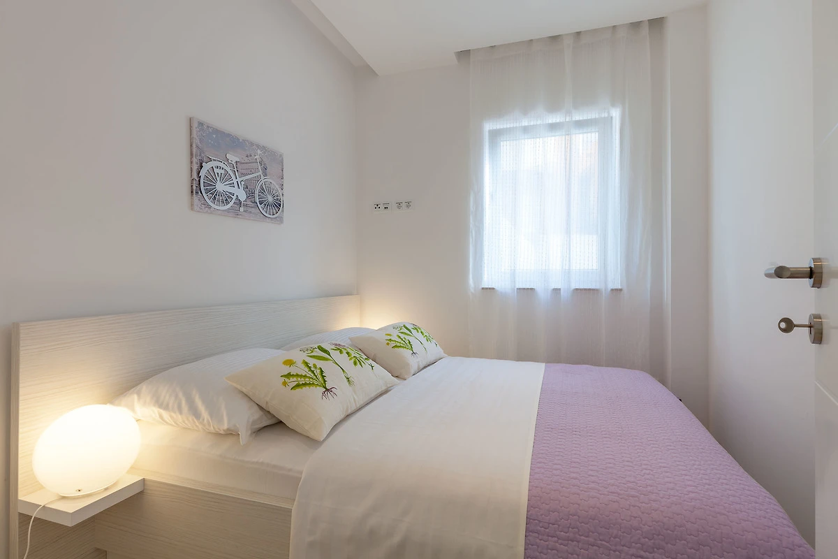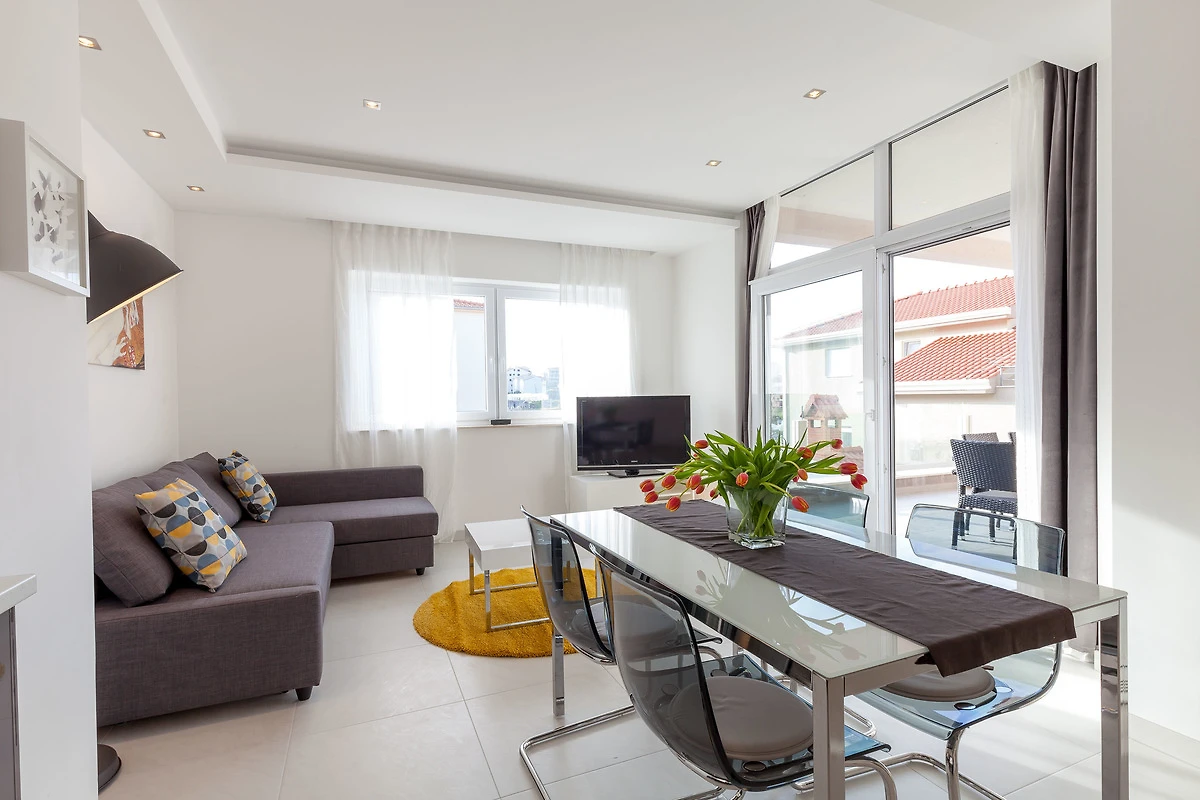 Das Appartement ist brandneu und befindet sich in einem privaten kleinen Gebäude in Podstrana und verfügt über einen privaten Parkplatz, nur 10-15 Minuten vom Zentrum von Split entfernt. Es gibt schöne Strände in der Nähe, 5 Gehminuten von der Wohnung entfernt (400 Meter).