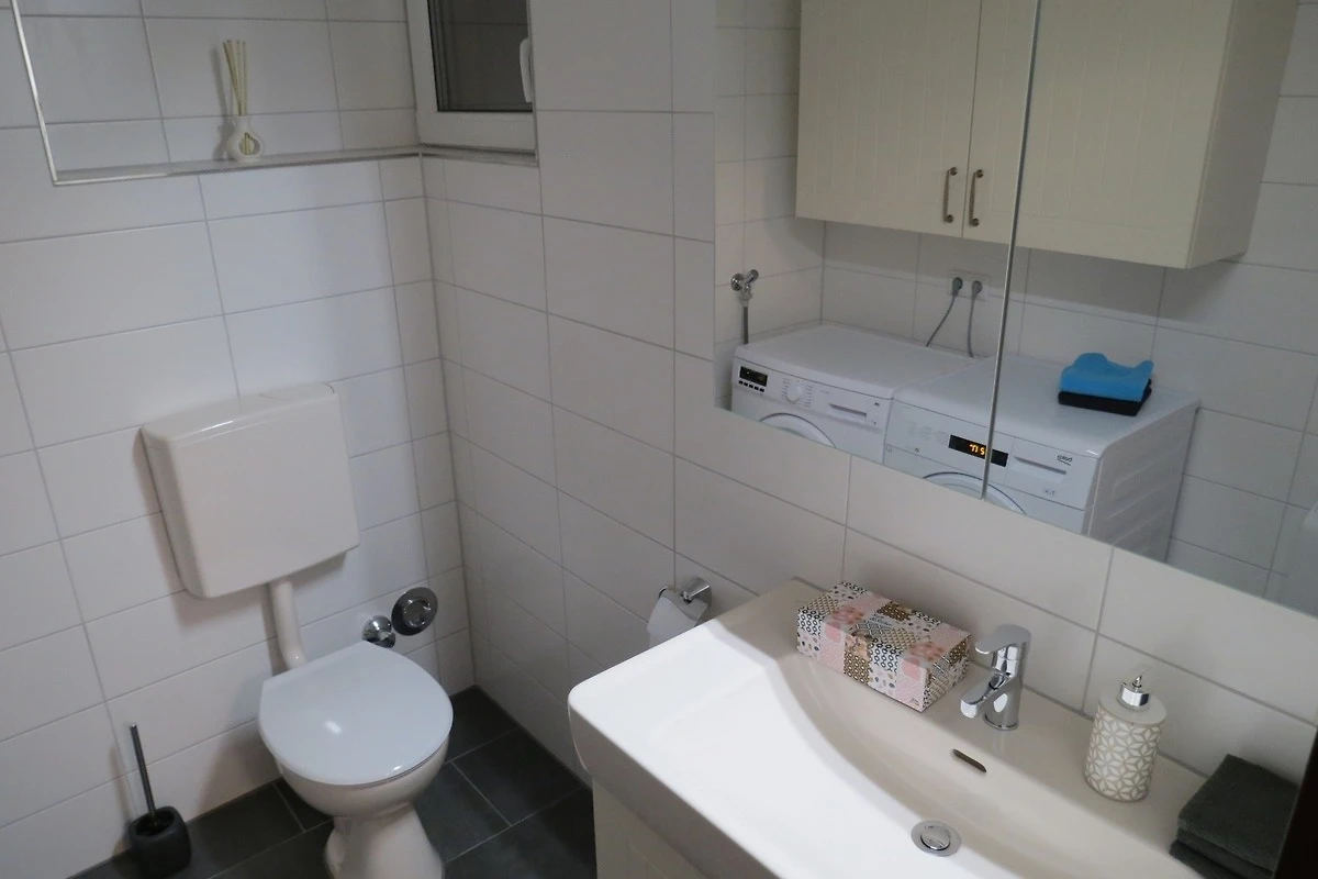 Das Badezimmer ist ausgestattet mit einer komfortablen Eckbadewanne, Doppelwaschbecken, Dusche, WC, Badezimmermöbel mit viel Platz für Ihre Badeutensilien, kleiner Balkon mit Wäscheständer, Fön, Bade- und Handtücher sind vorhanden. Weiterhin gibt es ein separates WC mit Waschmaschine, Trockner.