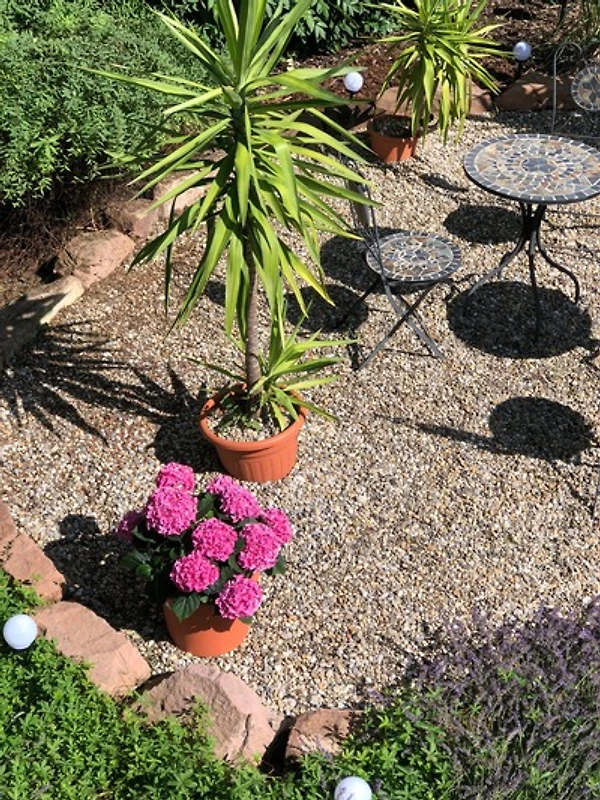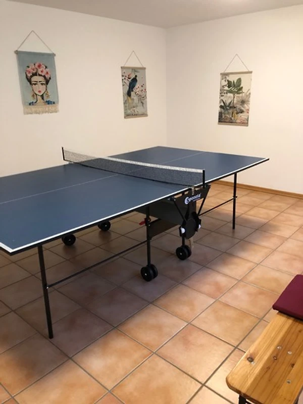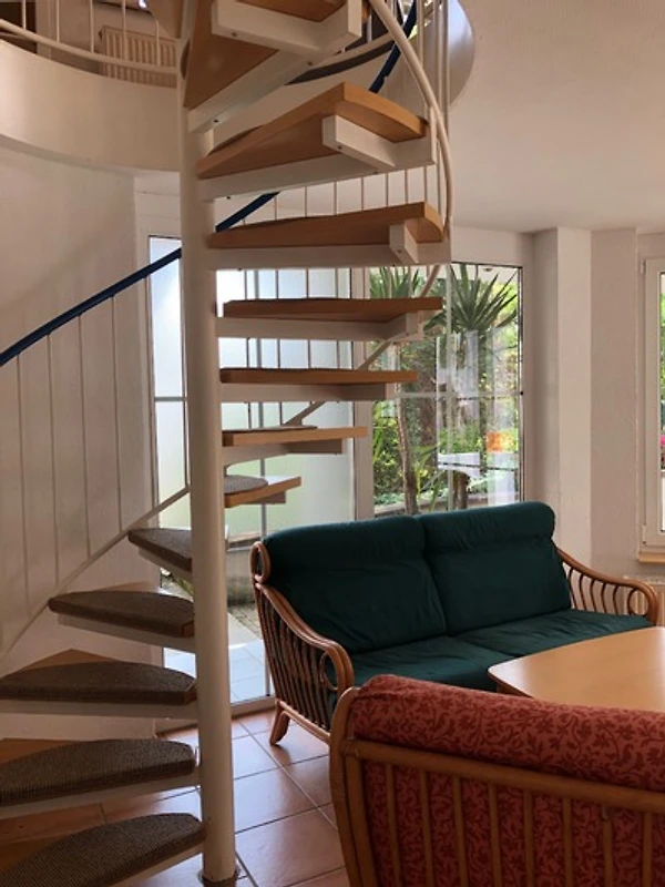 Über eine Wendeltreppe gelangen Sie vom Wohnbereich in den Wintergarten mit gemütlicher Sitz- und Grillmöglichkeit, Tischtennisplatte und Sitzgruppe im Garten von Mai bis September.