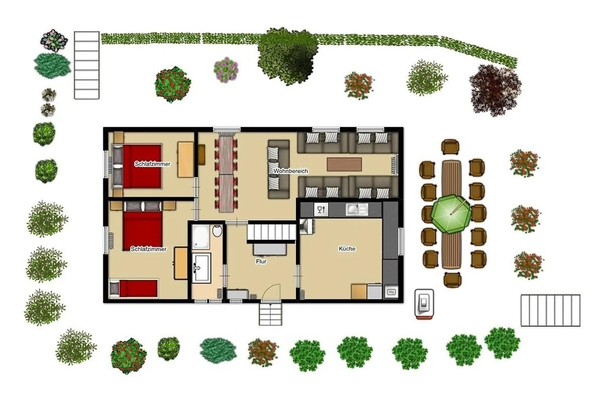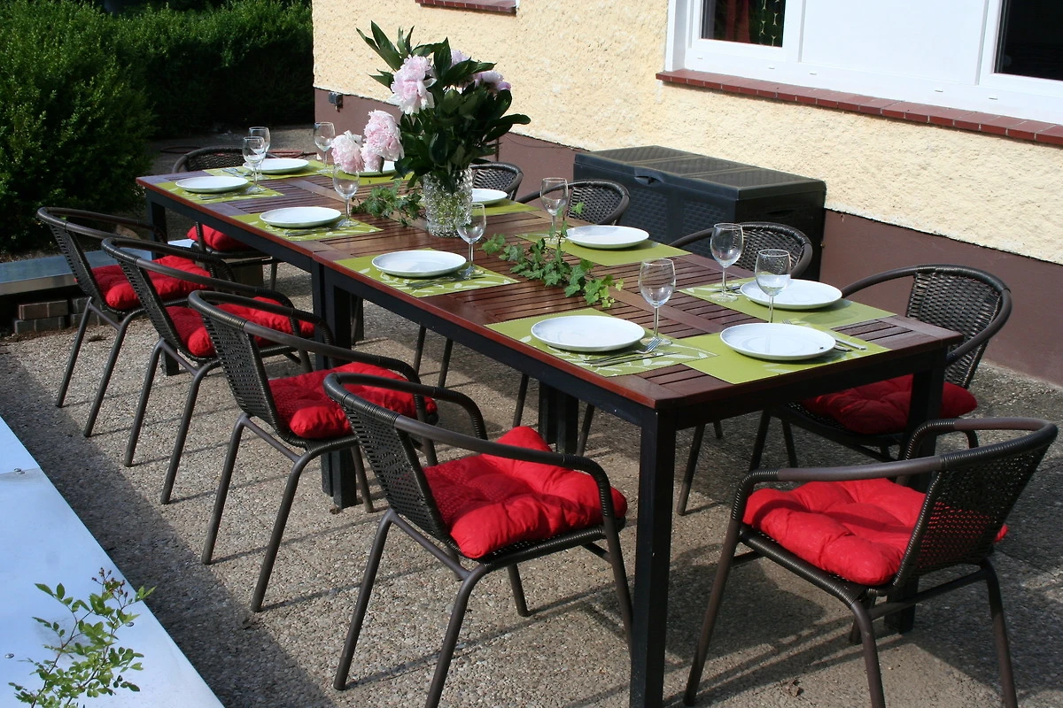 Direkt neben der Eingangstür befindet sich die gepflasterten Südterrasse und dem Garten. Auch hier befinden sich natürlich ausreichend Sitzmöglichkeiten für unsere Gäste.