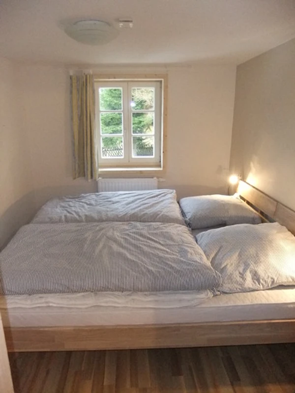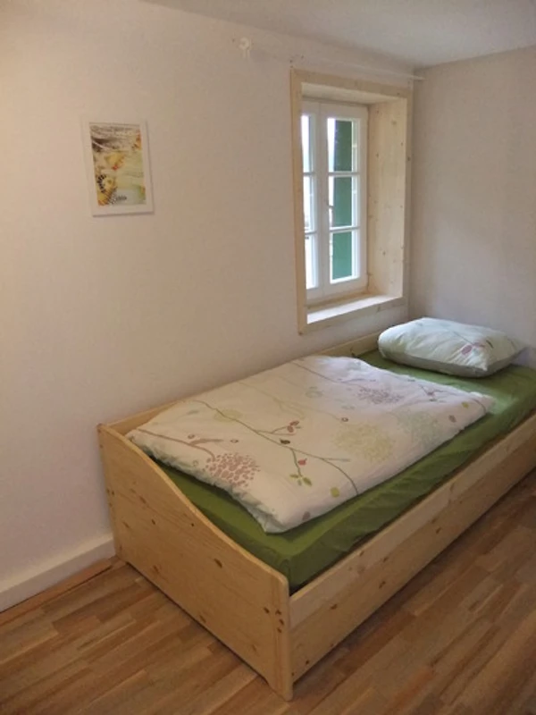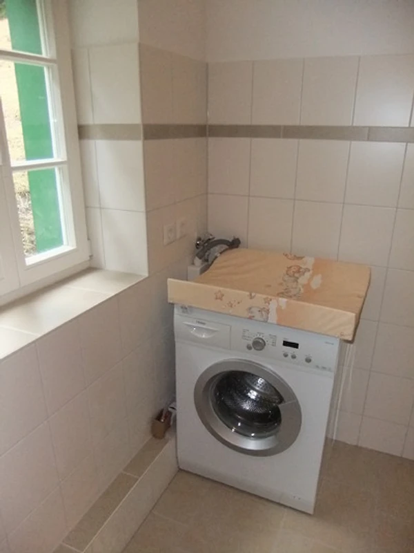Im Flur befindet sich das WC. Auf der linken Seite sind 2 Schlafzimmer (2x2-ideal für eine Familie geeignet. Ausserdem ist im Bad 1 eine DU, Waschmaschine, Waschbecken vorhanden.