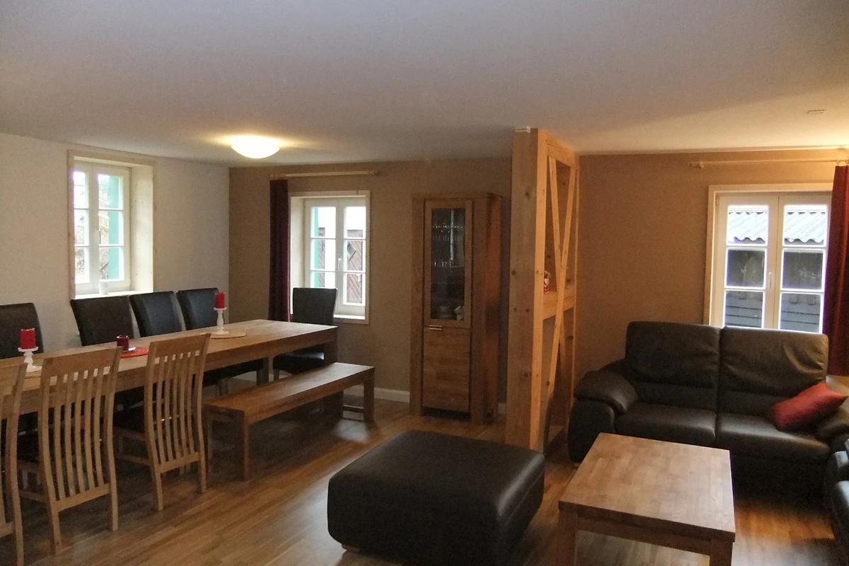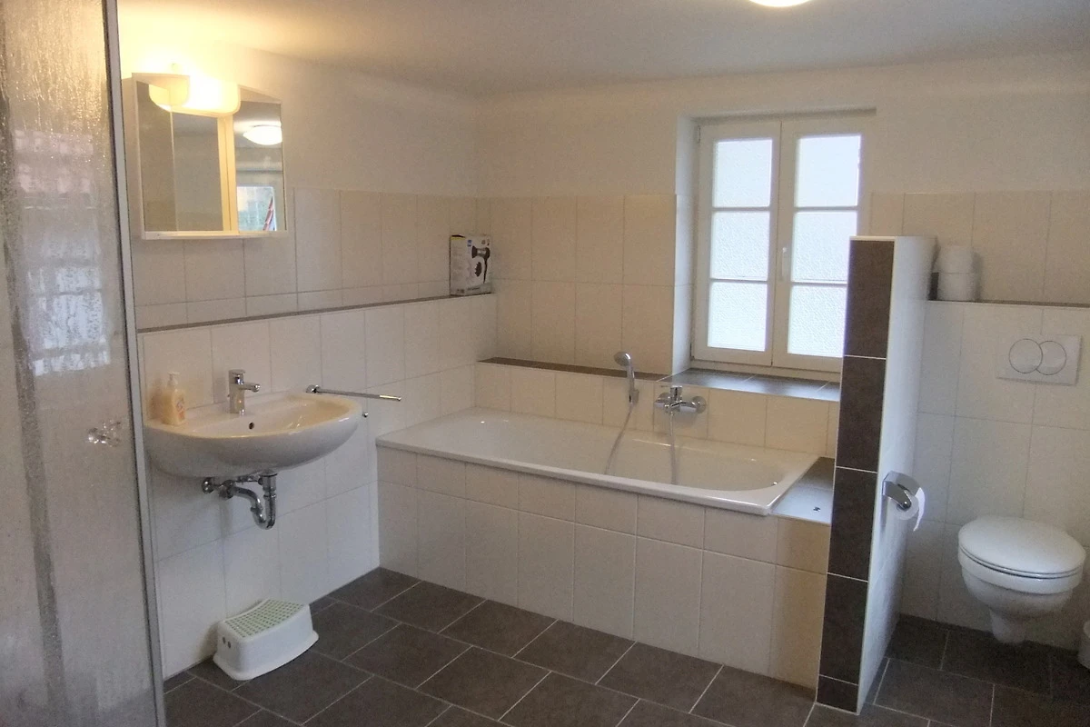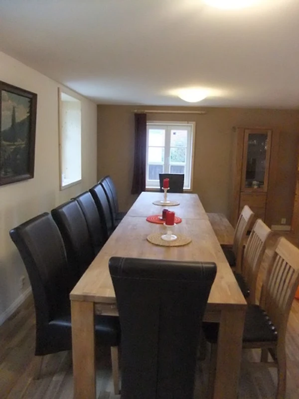 Im Erdgeschoss befindet sich das grosse helle Wohnzimmer mit Kamin , Fernseher, Sitzecke und Esstisch (14 Personen). Hier schliesst sich die neue Küche mit Gschirrspüler, Backofen, 4 Heizplatten, Toaster Kaffeemaschine, Wasserkocher, Geschirr u.a an.