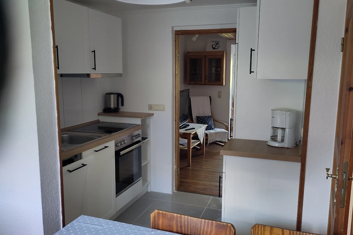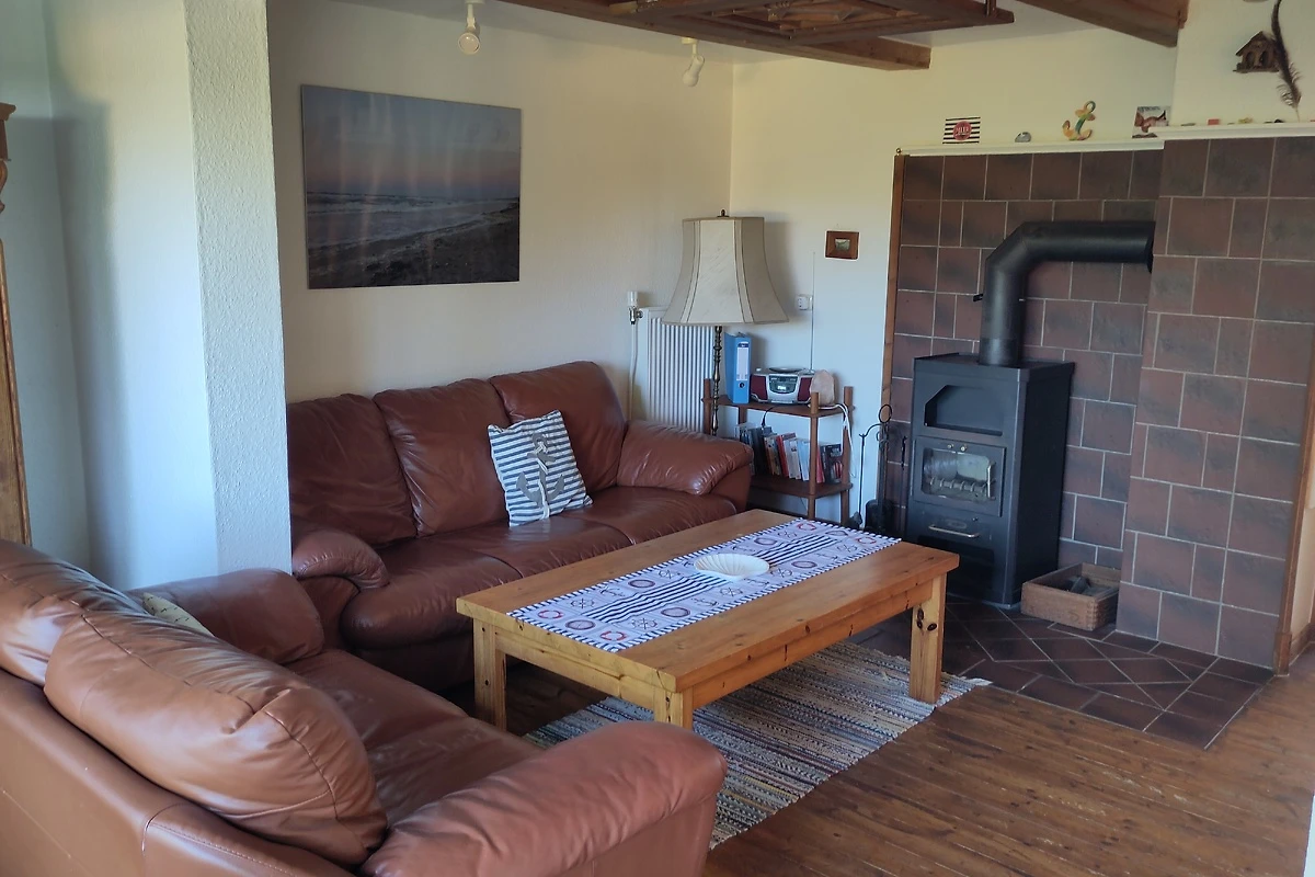 Im Erdgeschoss ist Wohnzimmer, mit zusätzlichem Kaminofen, Duschbad, sowie Küche mit Eßplatz.