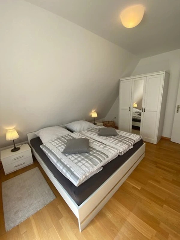 Schlafzimmer 1: ein bequemes Doppelbett, zwei Nachttische mit Leuchten und ein Kleiderschrank