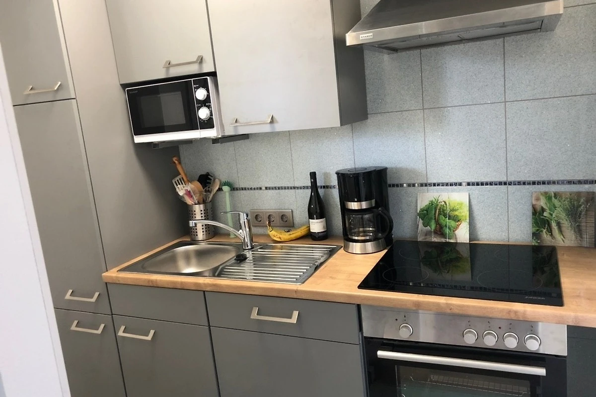 Es ist eine umfangreich ausgestattete Einbauküche vorhanden. Unter anderem gehören zum Inventar der Küche eine Spülmaschine, ein grosser Kühlschrank mit Gefrierfach, ein Backofen, eine Mikrowelle, eine Kaffeemaschine (für Senseo-Pads und Filtertüten), ein Wasserkocher, ein Eierkocher, ein Toaster, eine Kaffeeisolierkanne u.a.