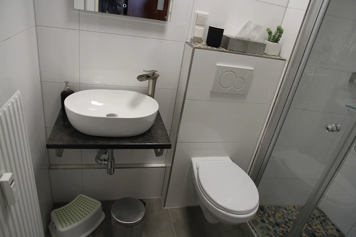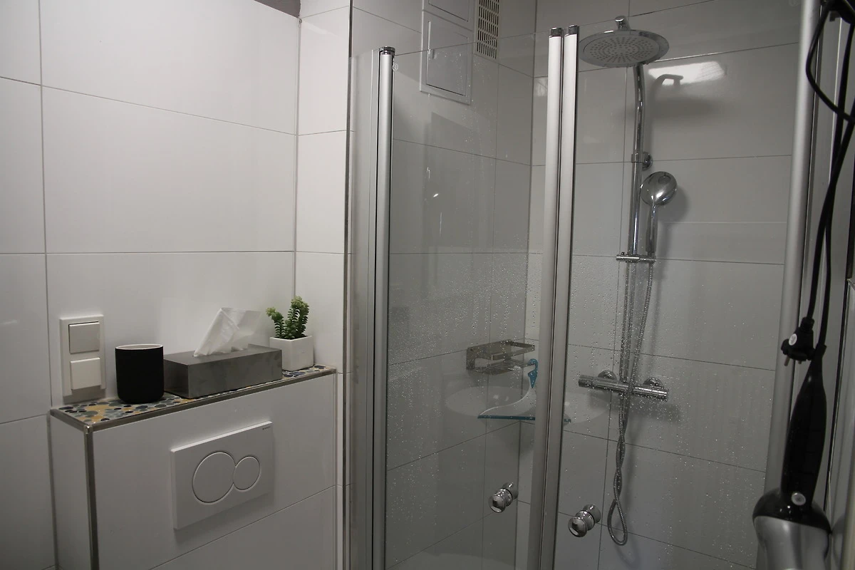 Im Bad, ausgestattet mit WC, Waschbecken und Dusche, stehen unseren Gästen auch ein Haartrockner, Handwaschseife und Kosmetiktücher zur Verfügung.