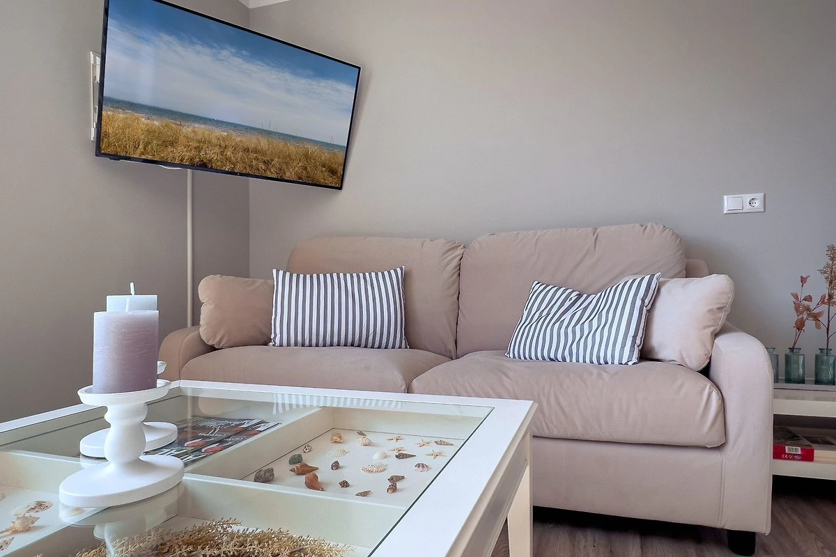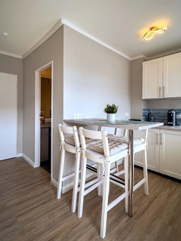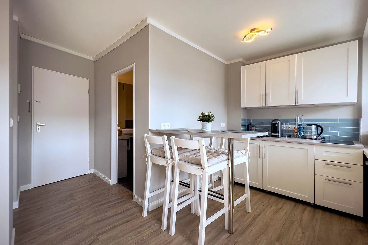 Das 1-Zimmer-Appartement in der Hansastrasse 2 bietet eine moderne und geschmackvolle Einrichtung im 4. Obergeschoss (ohne Lift) und eignet sich für bis zu 2 Personen. Der helle Laminatboden und die gemütliche Couch im Wohnraum schaffen eine einladende Atmosphäre. Die offene, moderne Küche ist mit einem Cerankochfeld mit 2 Platten sowie einer klassischen Kaffeemaschine ausgestattet. Im Wohnraum befindet sich ein grosser, schwenkbarer Flachbildfernseher und ein Doppelbett mit offenem Fussende, dessen Einstieg ausschliesslich vom Fussende möglich ist. Das Bad verfügt über eine Eckdusche, einen Waschtisch mit Handtuchwärmer und ein WC. Kostenfreies WLAN ist verfügbar. Ein Aussenstellplatz und eine Garage für Fahrräder und Strandutensilien stehen zur Verfügung. Ein Hund kann auf Anfrage gegen Aufpreis mitgebracht werden. Rauchen ist in diesem Appartement nicht gestattet.