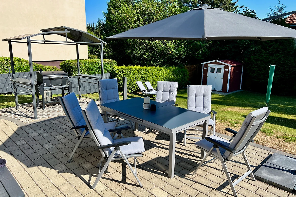 Den Feriengästen steht sowohl eine Garage mit automatischem Sektionaltor, ein Carport als auch ein eigener Parkplatz direkt vor dem Haus zur Verfügung. Beim Eintreten in das neue Feriendomizil führt der Weg durch einen Flur direkt in die luxuriöse und moderne Küche, wo Sie bei einem Glas Sekt oder Tässchen Kaffee zunächst einmal ankommen können.