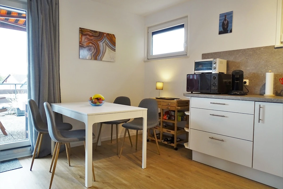 Geniessen SIe Ihren Urlaubsaufenthalt in unserer frisch renovierten Appartementwohnung inmitten des Ostseebades Dahme. Ihr Feriendomizil ist im 2. Obergeschoss einer kleinen gepflegten Appartementanlage gelegen und verfügt über Eingang/Flur mit Garderobe und Schrank, 1 separates Schlafzimmer mit (ca.140x200cm) Doppelbett (durchgängige Matratze) und Kleiderschrank, hell und modern gestaltetes Wohnzimmer mit bequemer Federkern- Ausklappcouch (ca.140x200cm), Esstisch mit Bestuhlung und neuer moderner Küchenzeile TV Schrank und 1 Sessel mit Fussteil... Das Badezimmer ist mit Regalen, Dusche, WC und Waschbecken ausgestattet. Alle Fenster sind mit Rolläden verdunkelbar. Die Dachterrasse, welche vom Wohnzimmer und vom Aussenbereich des Appartements erreichbar ist, bietet sehr viel Platz an der frischen Luft und läd zum "Sonnenbaden" ein. Hier steht ein Strandkorb, 2 Liegen und Gartenbestuhlung für Sie bereit.....Ausrichtung süd/süd-west....