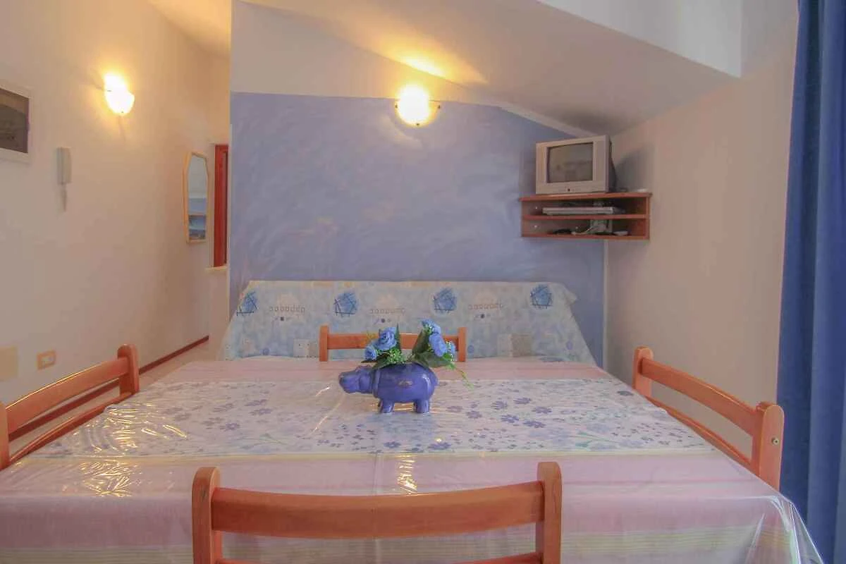Wohnzimmer (Durchgangszimmer) mit 1 Zusatzbett auf Couch/Sofa, Sitzecke, TV und Essecke (4 Plätze). Schlafzimmer mit 1 Doppelbett. Kochecke in der Wohnküche (Durchgangszimmer) mit Essecke, Elektroherd (2 Platten), Kühlschrank, Mikrowelle und Kaffeemaschine. Bad mit Dusche, 1 Waschbecken, WC und Fenster.