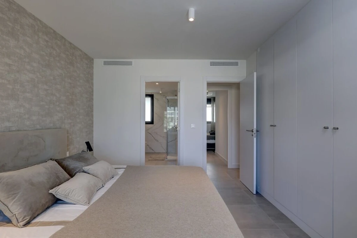 Parterre: (Wohnzimmer(TV), Küche(Esstisch, Kochherd, Kaffeemaschine, Mikrowelle, Kühl-/Gefrierkombination), Schlafzimmer(Doppelbett), Schlafzimmer(Doppelbett), Schlafzimmer(Doppelbett), Badezimmer(Badewanne, Dusche, Waschbecken), Badezimmer(Dusche, Waschbecken), Balkon, Heizung, Klimaanlage)