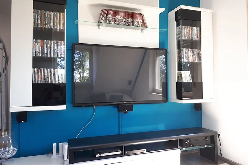 Entspannen Sie nach dem Abendessen in unseren gemütlichen grossen Sofas vor dem Fernseher oder bei einem gemeinsamen Spieleabend mit unserer Nintendo Wii. Unsere moderne Schrankwand bietet neben einem grossen Flachbildfernseher mit Dolby Surround Anlage und Blu-Ray DVD-Player, eine riesige DVD Sammlung mit älteren und aktuellen Filmen. Haben Sie keine Lust auf einen Filmabend, dann zocken Sie doch auf unserer Nintendo Wii Spielekonsole. Die Wii bietet Ihnen nicht nur lockere Partyspiele, welche meist auch sehr familientauglich sind, sondern auch alte Klassiker wie Mario Kart oder Wii Sports. Oder zeigen Sie doch welche Rocklegende hinter Ihnen steckt und rocken Sie mit dem Wii Guitar Hero das Wohnzimmer.