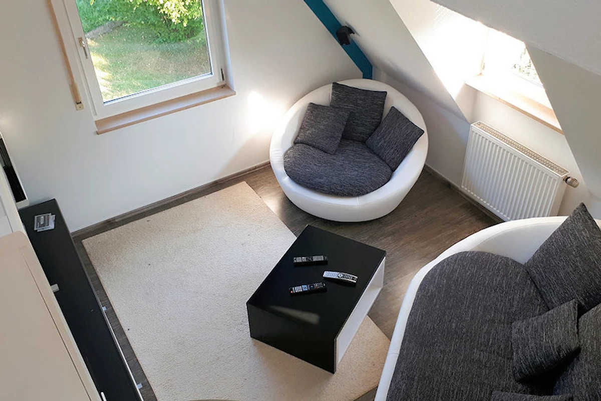 Die sonnigen Ferienwohnungen liegen idyllisch am Ortsrand und Fernblick auf Wiese und Bäume mit absoluter Ruhe - ideal für einen erholsamen Urlaub. Gräfensteinberg ist ein Ortsteil mitten im Herzen des fränkischen Seenland. Unser gemütlicher Balkon lädt mit Fernblick und absoluter Ruhe zum gemütlichen Frühstücken und Relaxen ein. Rechts am Balkon haben Sie Blick auf den Gräfensteinberger Weiher mit kleinem Bachlauf. Im Gartenanteil des Hauses können Sie mit Gartenmöbel und Sonnenliegen verweilen und im Grünen entspannen.