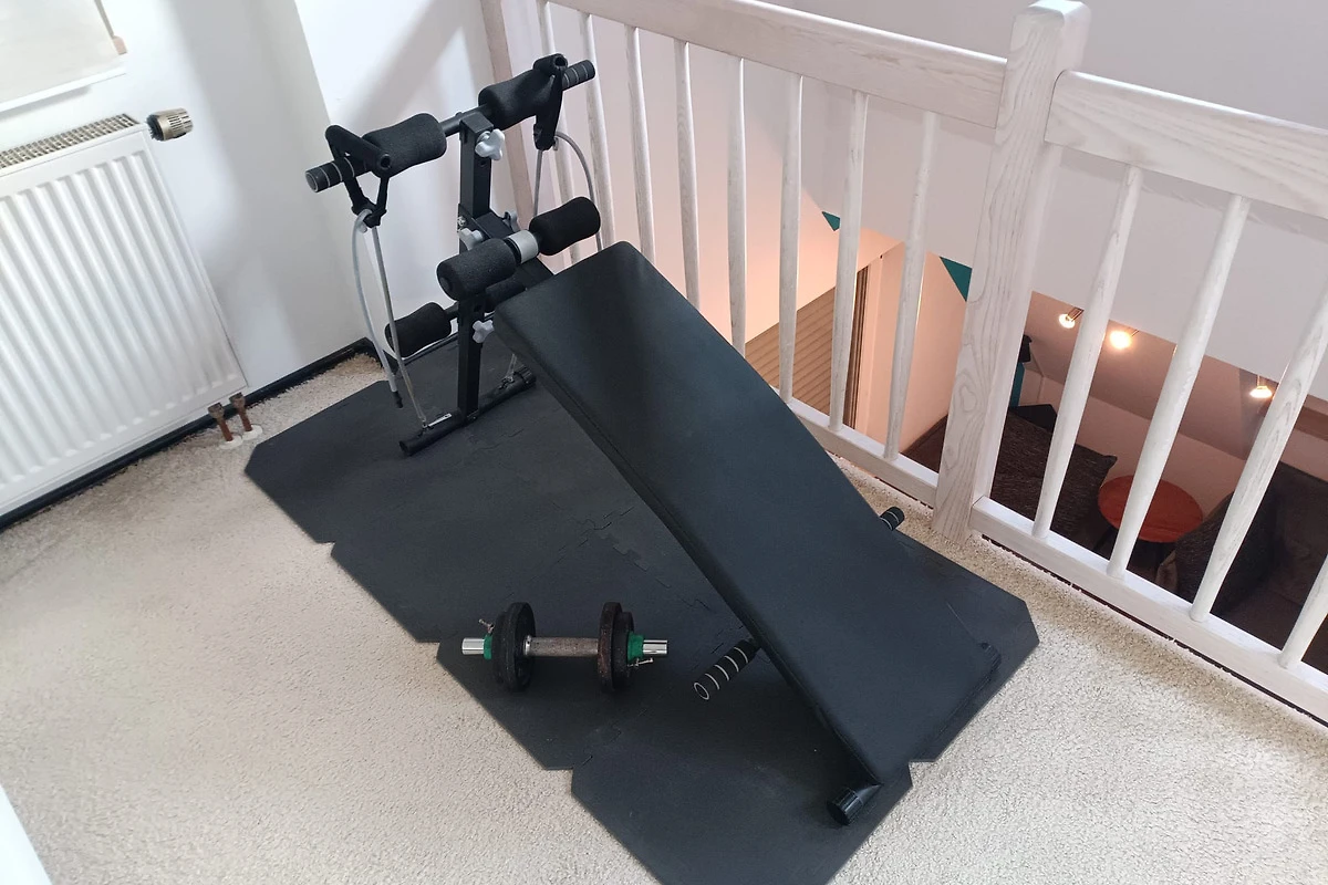 – Kleine Trainingsecke für aktive Gäste ? - In unserer kompakten Trainingsecke stehen Ihnen verschiedene Möglichkeiten für Krafttraining zur Verfügung: Hantelbank, Kurzhanteln und Widerstandsbänder.
