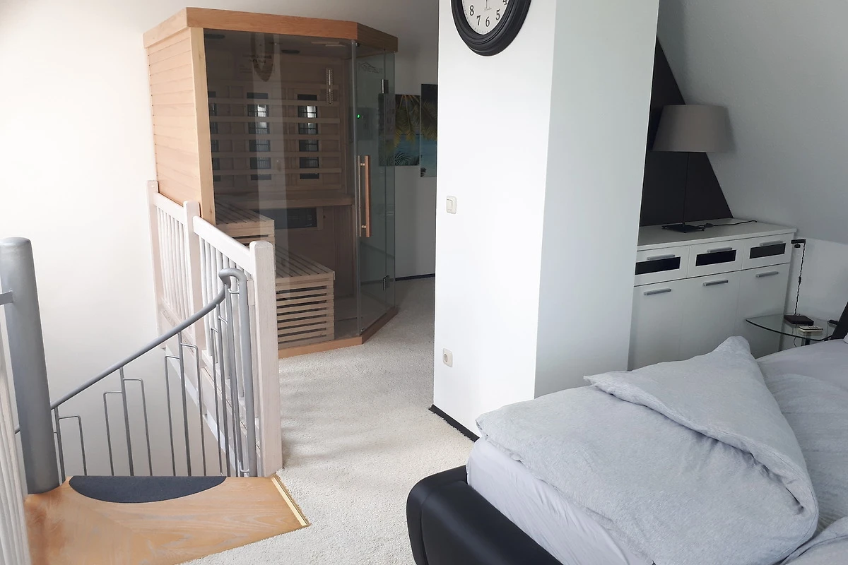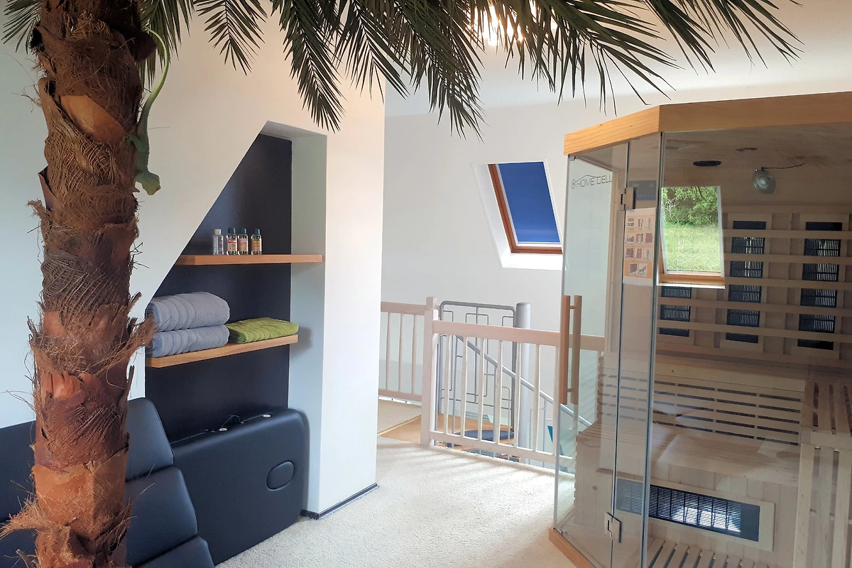 Mit einer sanften und wohlige Wärme empfängt Sie unserer Infrarotsauna aus kanadischem Hemlock Tannenholz bei bis zu 60 Grad. Für Menschen, denen die traditionelle Sauna zu heiss ausfällt und die zu Kreislaufbeschwerden neigen, ist unsere Infrarotsauna eine hervorragende Alternative, da sie den Organismus durch die angenehmeren Temperaturen nicht so stark belastet. 8 Hochleistung-Vollspektrumstrahler und 1 Flächenstrahler verwöhnen ihren Körper nach einer ausgiebigen Wandertour im fränkischen Seenland! Die Lichttherapie mit wechselndem Lichteffekt in der Kabine lässt Sie zur Ruhe kommen und es stellt sich ein wunderbares Gefühl der totalen Entspannung ein.