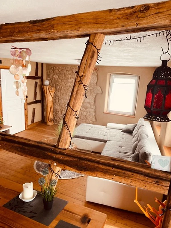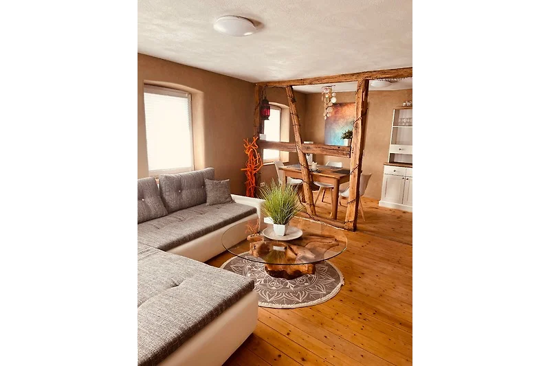 Der grosse Wohn/Essraum ist mit offenem Fachwerk getrennt.