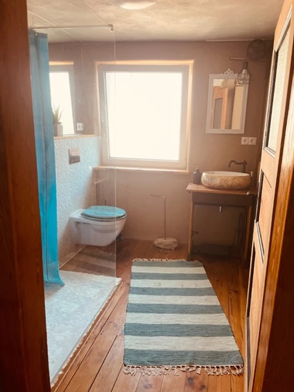 Das Badezimmer ist mit einer grossen Familiendusche und warmen Wänden ausgestattet.
